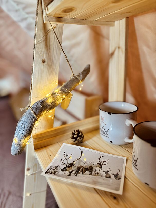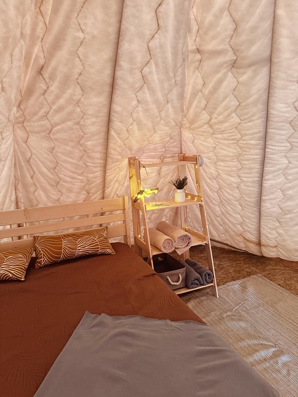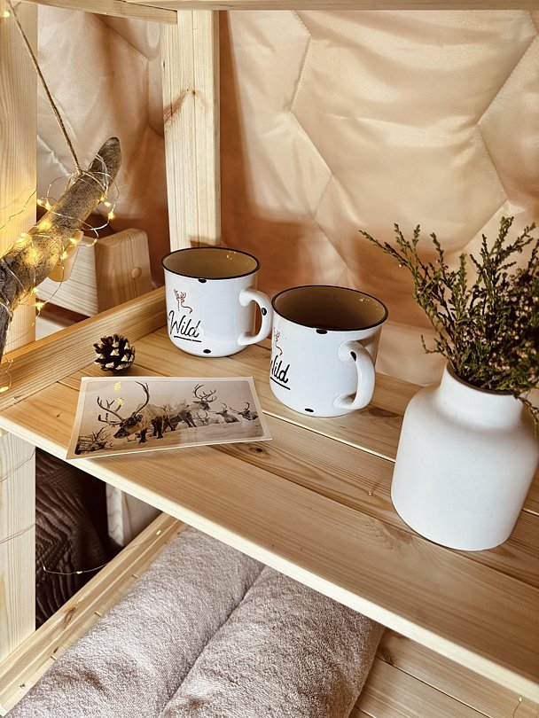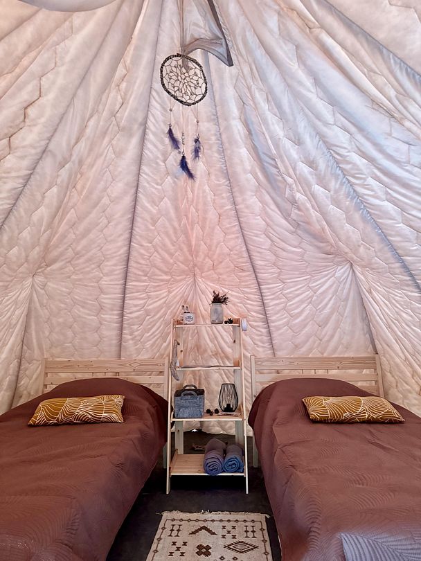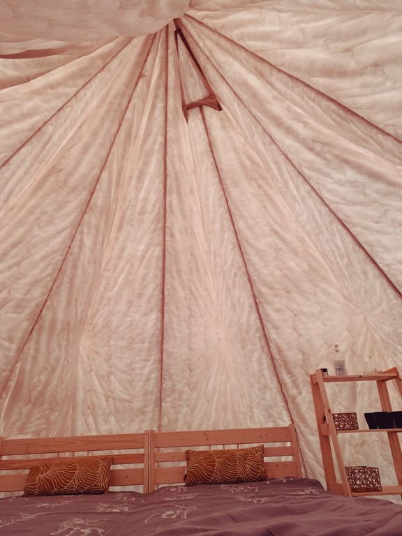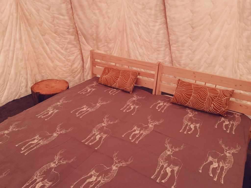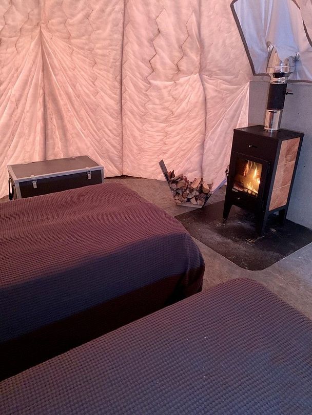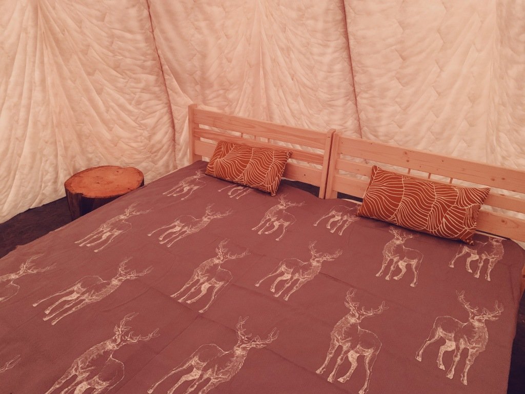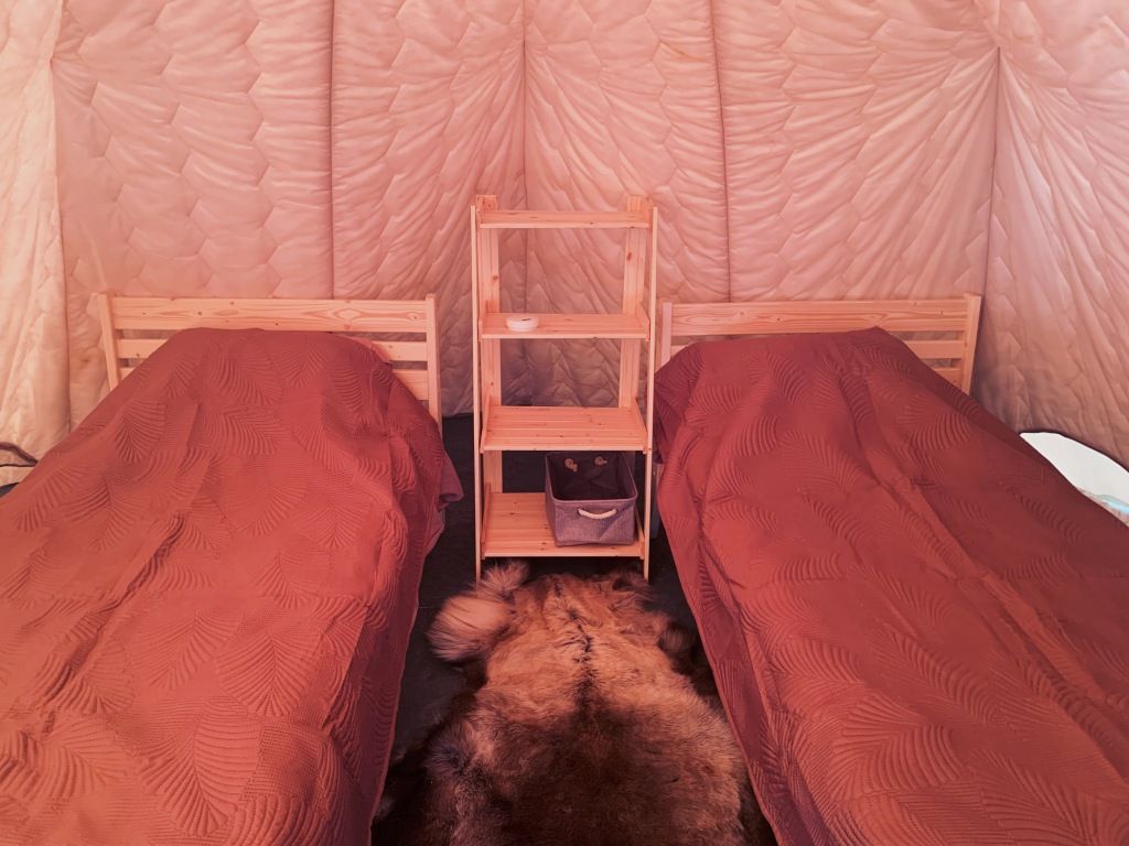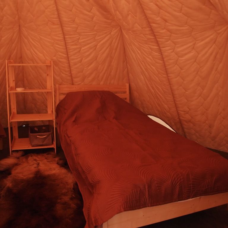 В чуме есть все необходимое: две односпальные кровати с ортопедическим матрасом, теплые пуховые одеяла, хлопковое постельное белье, стеллаж для вещей, печь-камин + дрова и все необходимое для розжига.