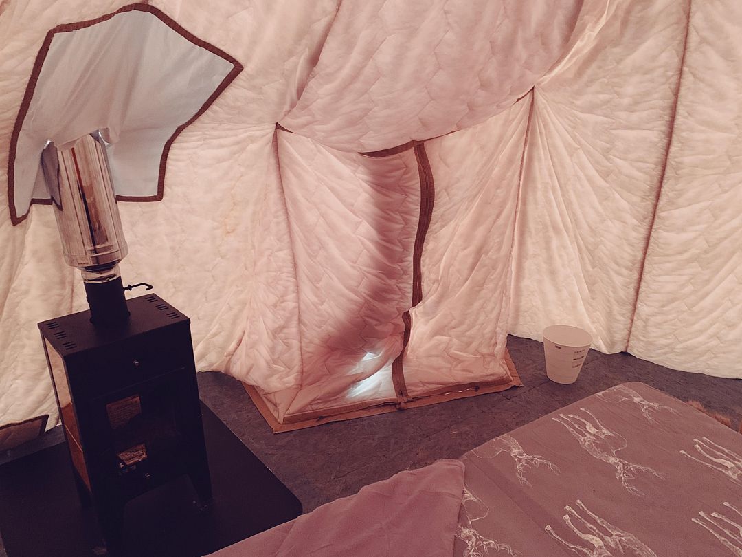 Отопление в чумах от печи на дровах, палатка с утеплителем и утепленным полом, однако в холодное время года необходимо регулярно поддерживать горение — каждые 2–3 часа закладывать дрова.