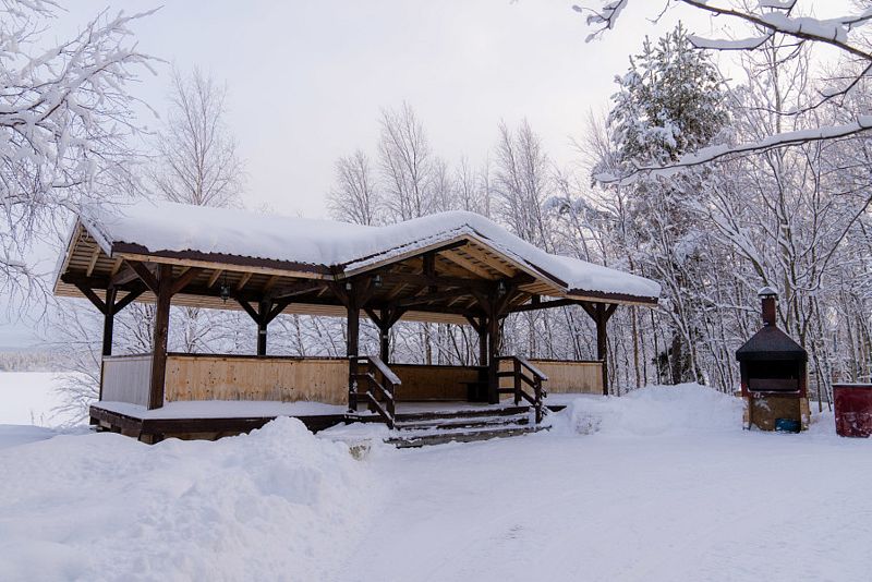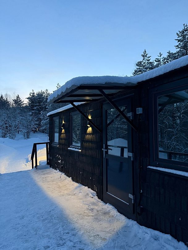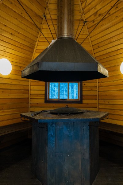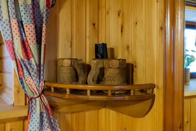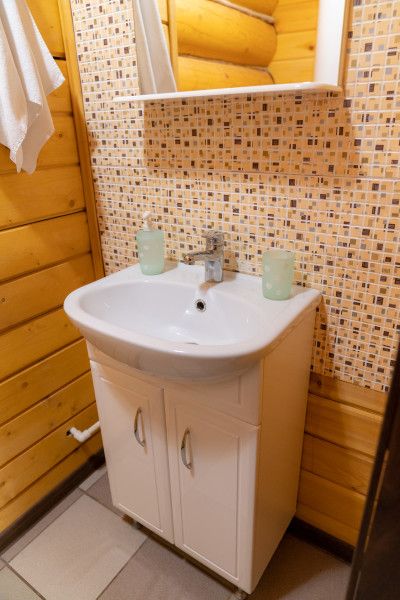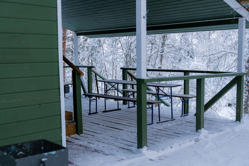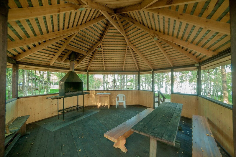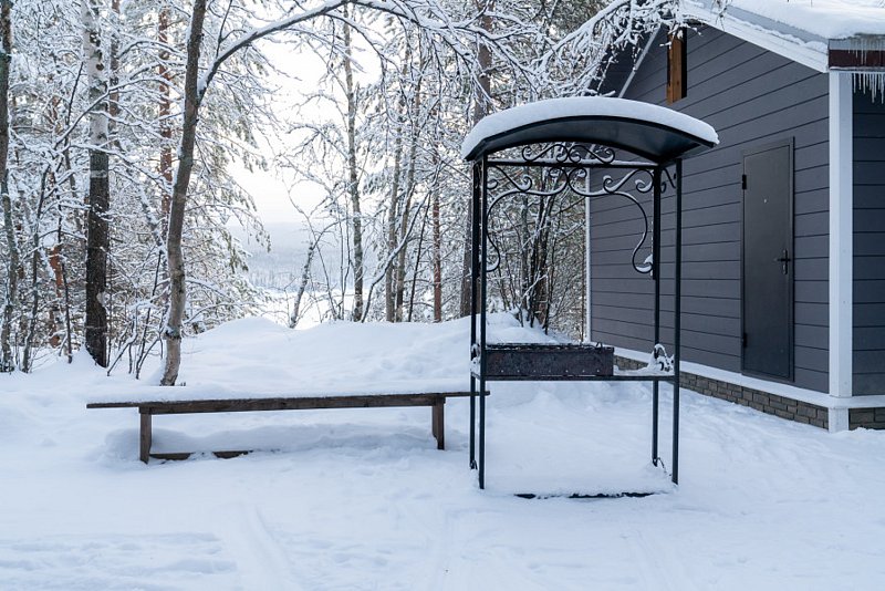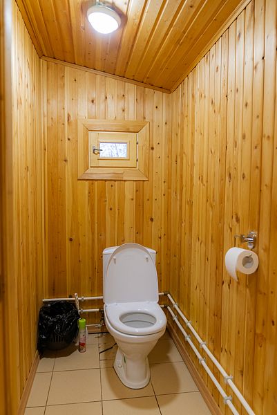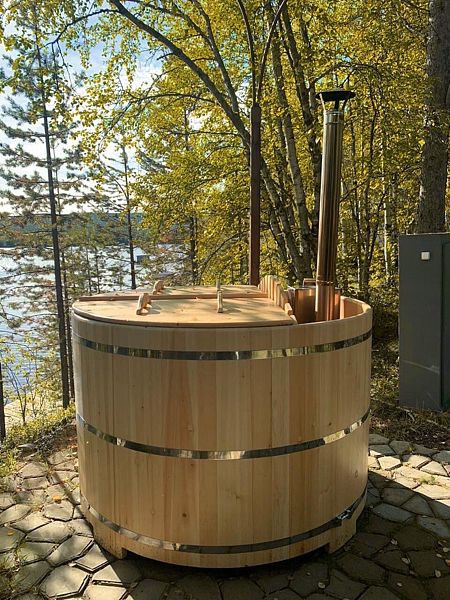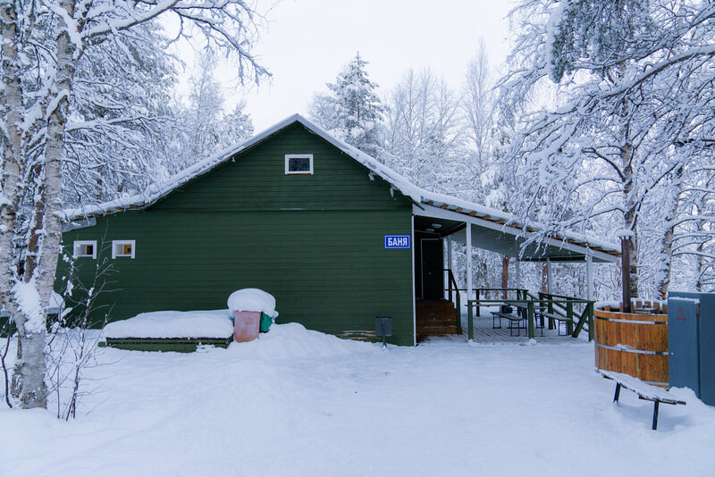 Купель расположена рядом с дровяной баней, где можно оставить вещи и воспользоваться уборной. Рядом с баней и купелью находится спуск по лестнице на пирс.