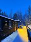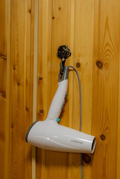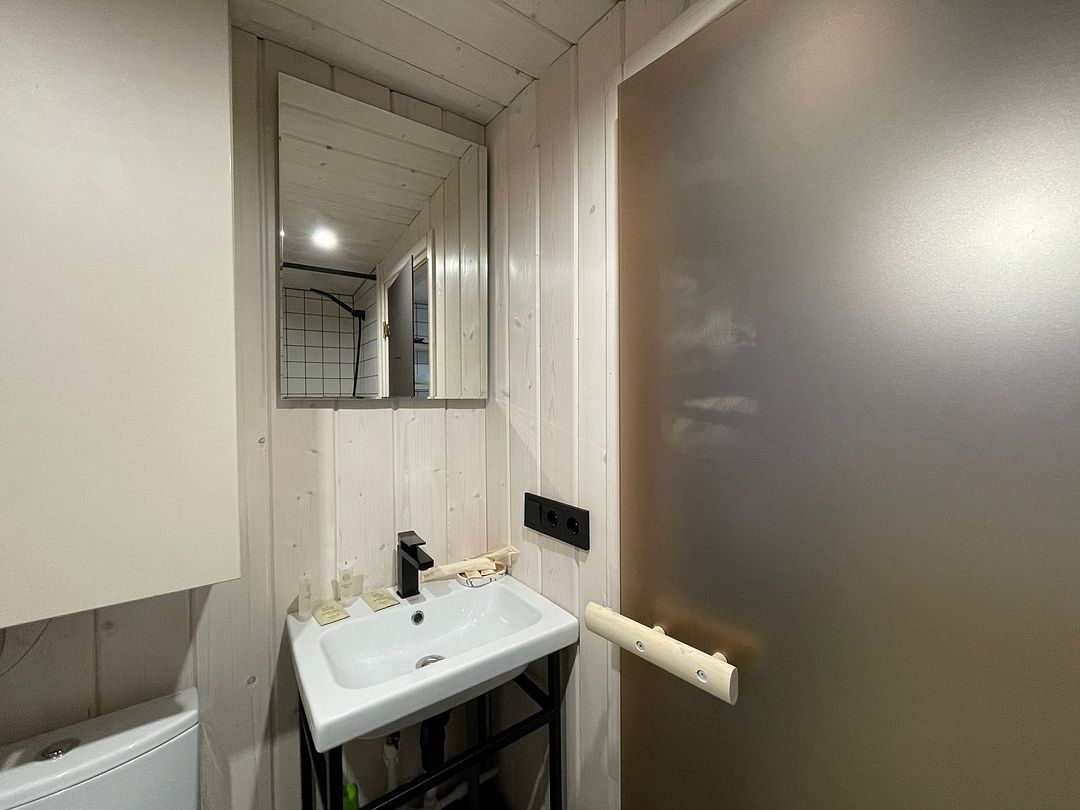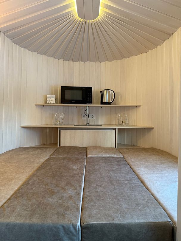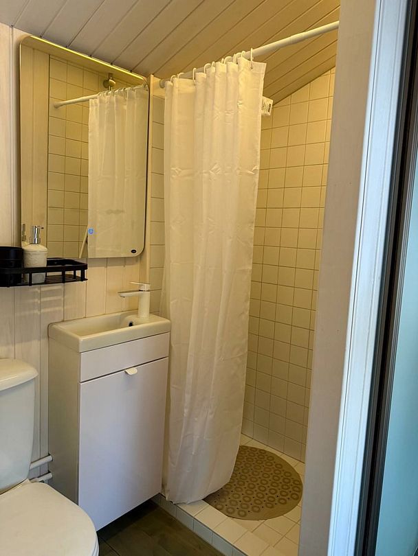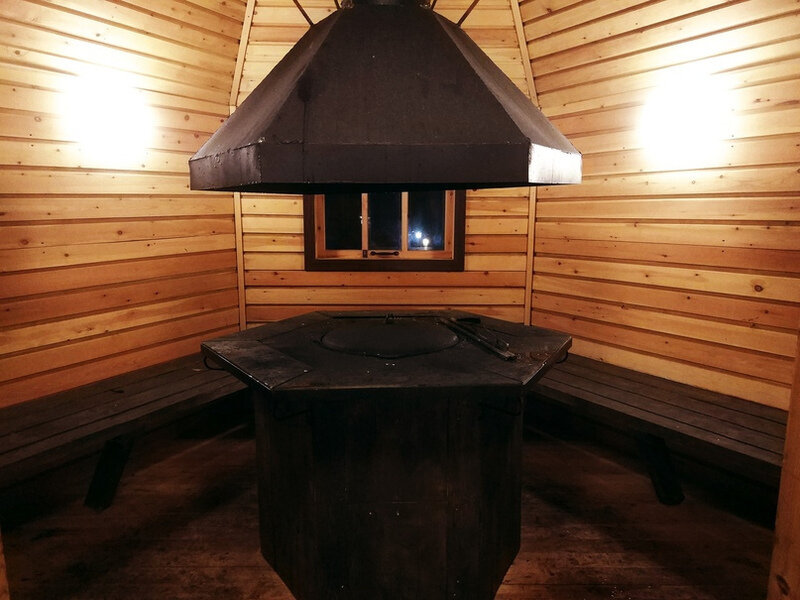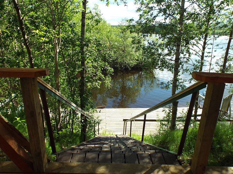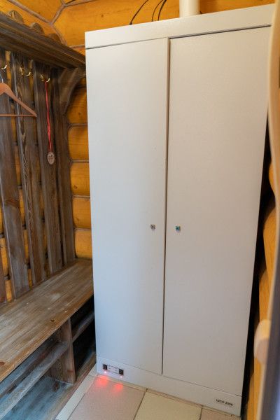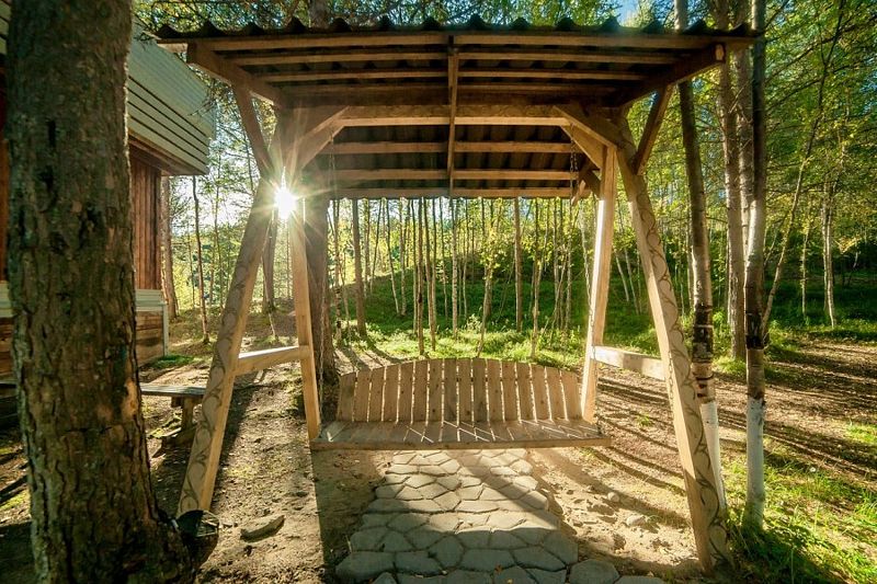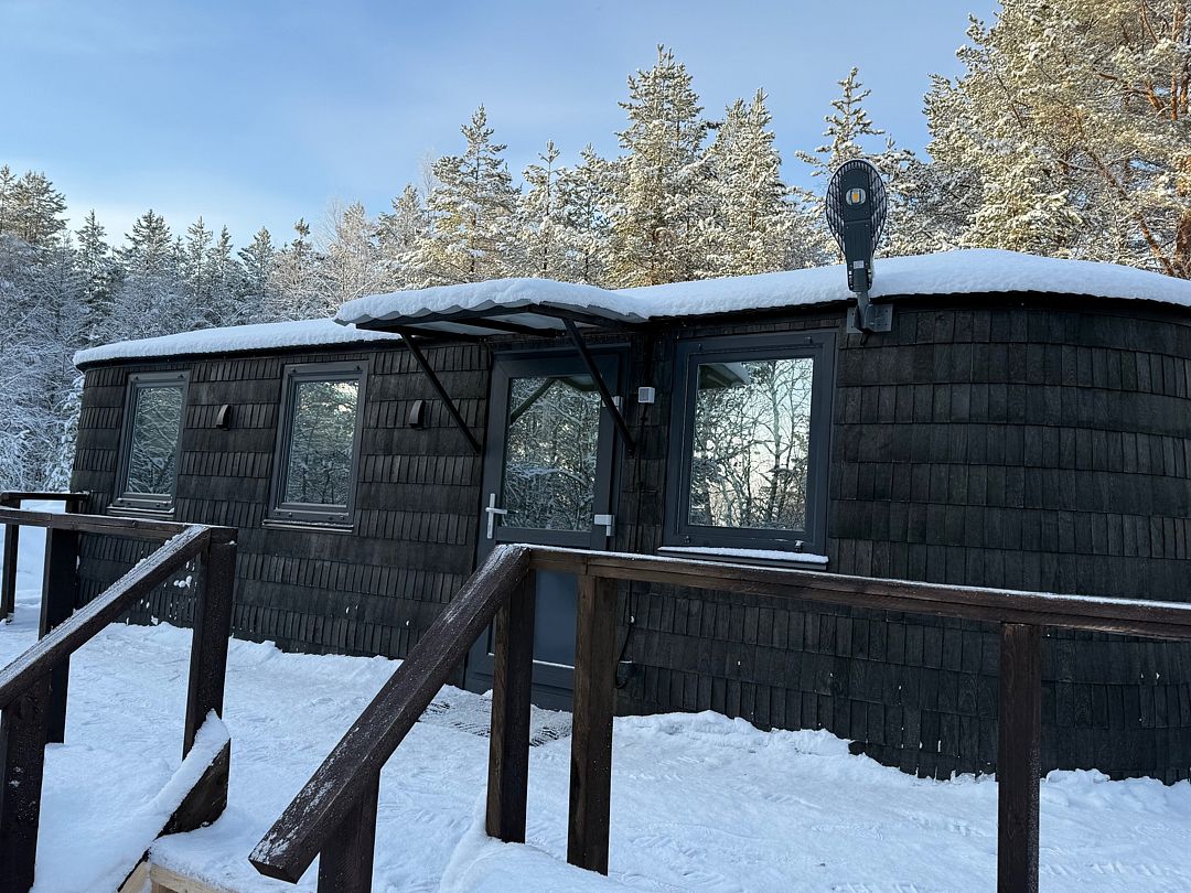 Купель расположена рядом с дровяной баней, где можно оставить вещи и воспользоваться уборной. Рядом с баней и купелью находится спуск по лестнице на пирс.