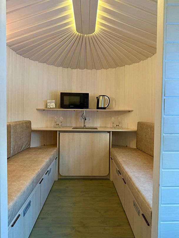 - Кухонная зона с диванами, трансформирующимися в дополнительное двуспальное место;