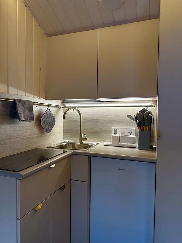 Техническое оснащение: мини-холодильник , варочная панель, СВЧ-печь, электрочайник, фен.
