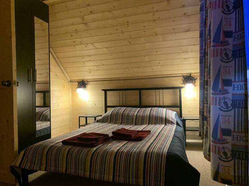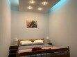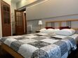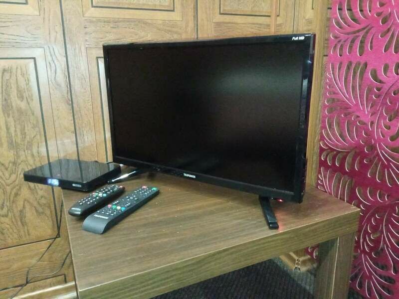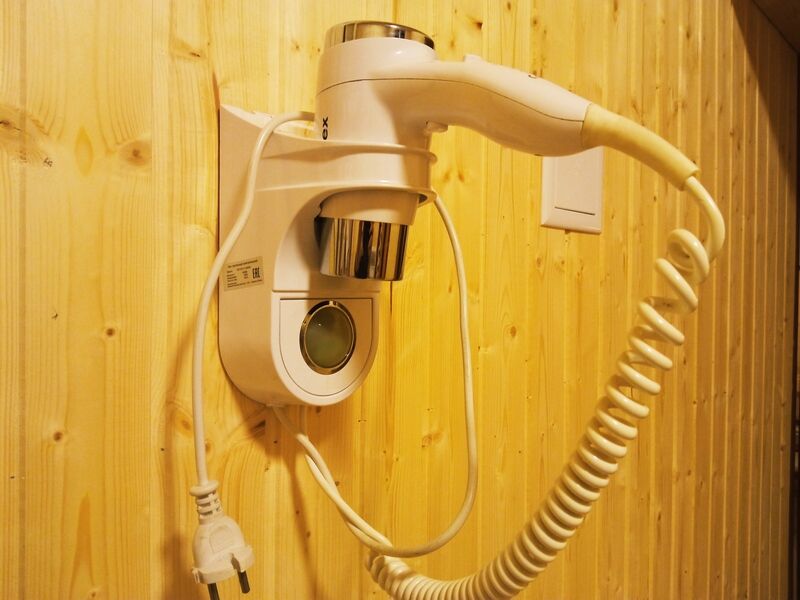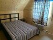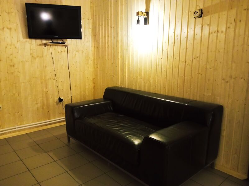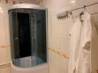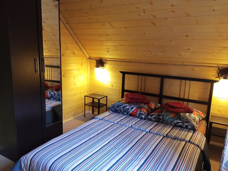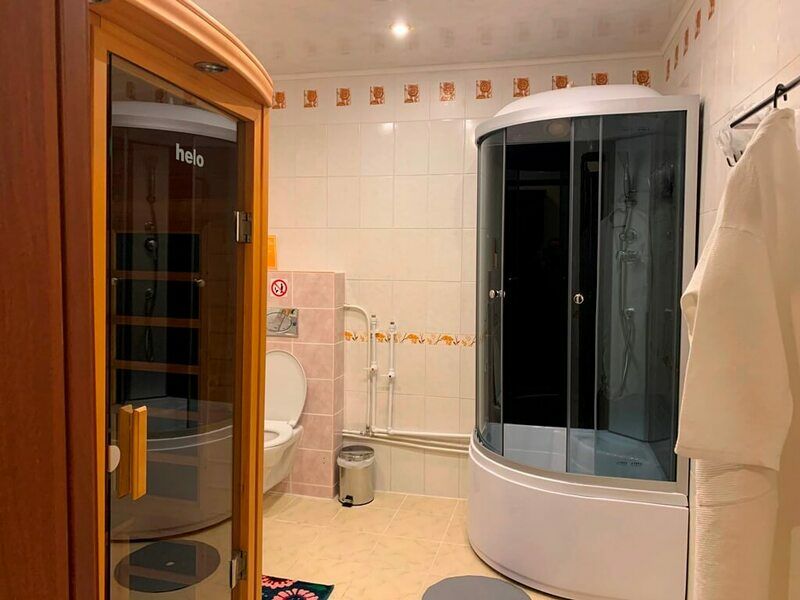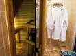 Большая двуспальная кровать. Санузел с душем, сауна. Кресло, телевизор, фен.