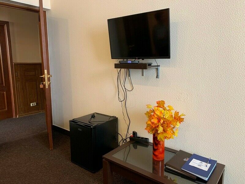 Двуспальная кровать, 1-спальная кровать, шкаф, стол, кресла, холодильник, душ, туалет, TV, Wi-Fi, телефон, фен.