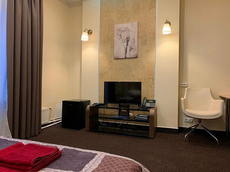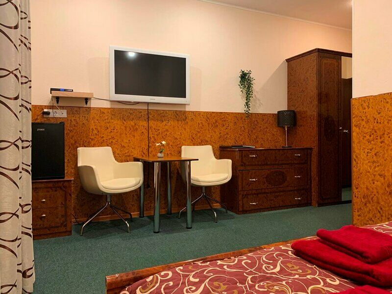Двуспальная кровать, шкаф, стол, кресла, холодильник, душ, туалет, TV, Wi-Fi, телефон, фен.