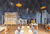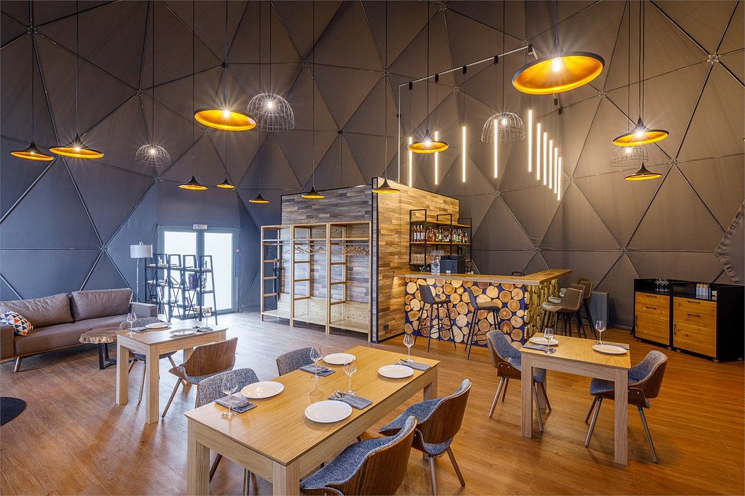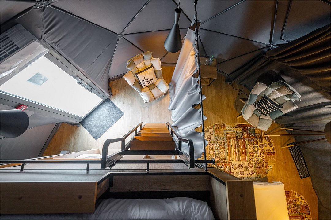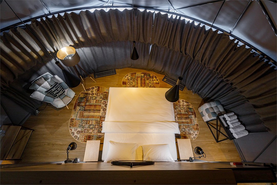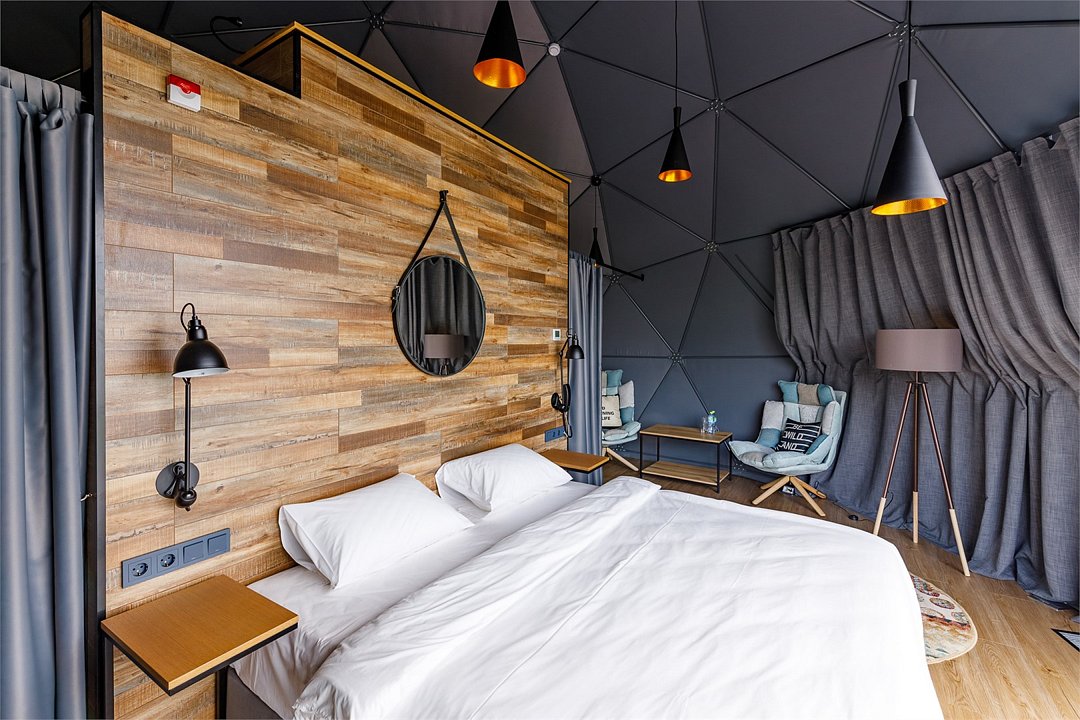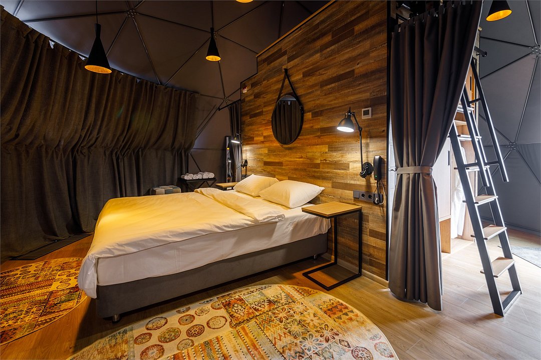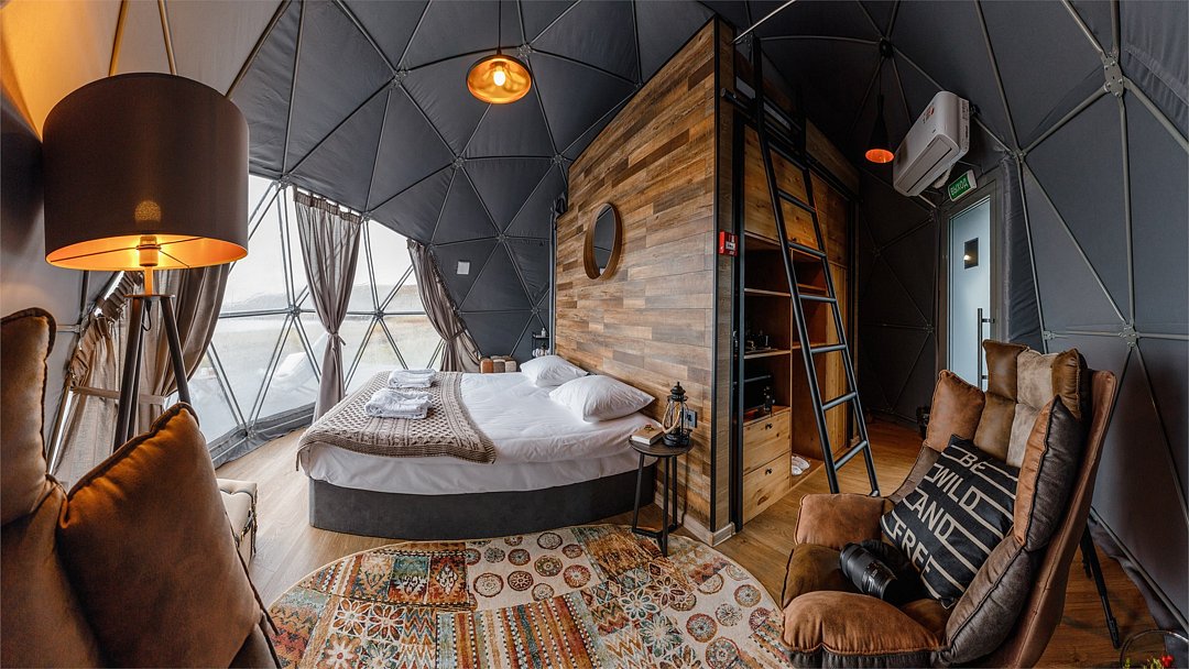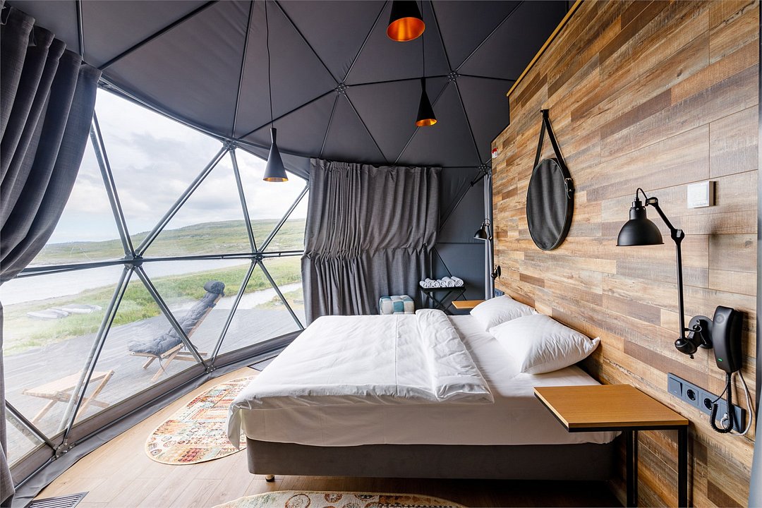 Здесь с комфортом может разместиться семья с двумя детьми. Удобная двуспальная кровать, которую мы можем заменить на две односпальные. Кровать для двух детей (или третьего взрослого) — на втором уровне. Зона отдыха с креслами. Шкаф и помещение для сушки одежды. Двойное отопление: сплит-система и радиатор. Душ и туалет. Вы пьёте воду, которая поступает из северного озера и проходит глубокую очистку. Каждая экосфера — как комфортабельный гостиничный номер. Из панорамного окна видно Баренцево море и (иногда) северное сияние.Услуги и удобства