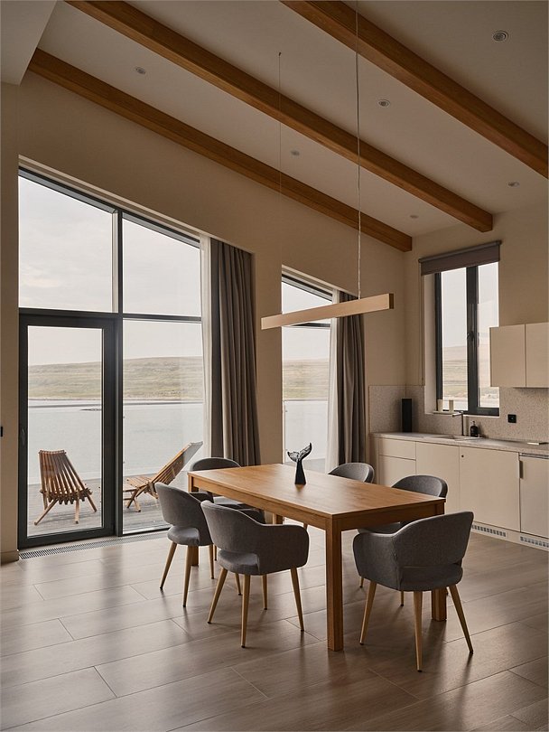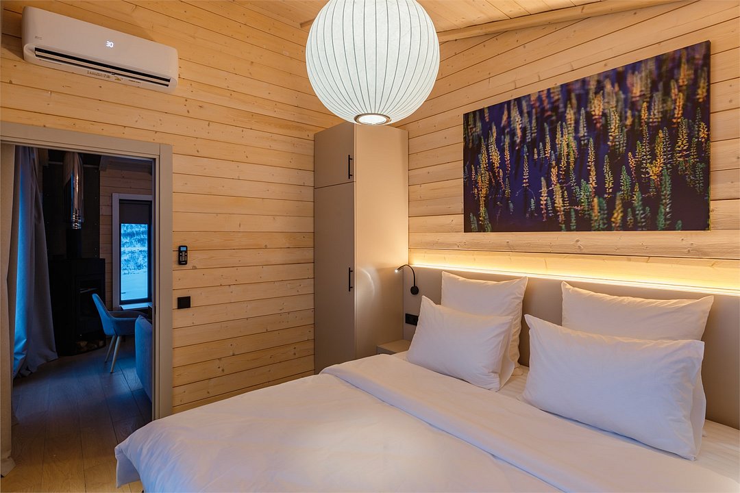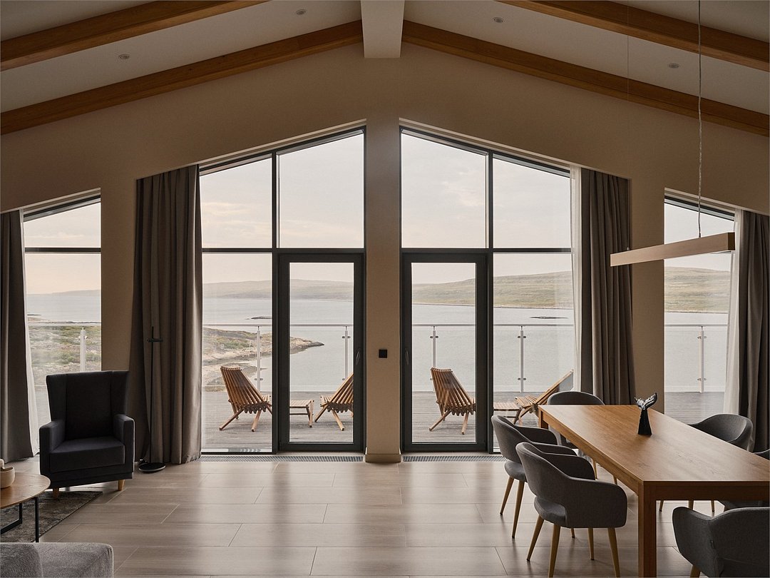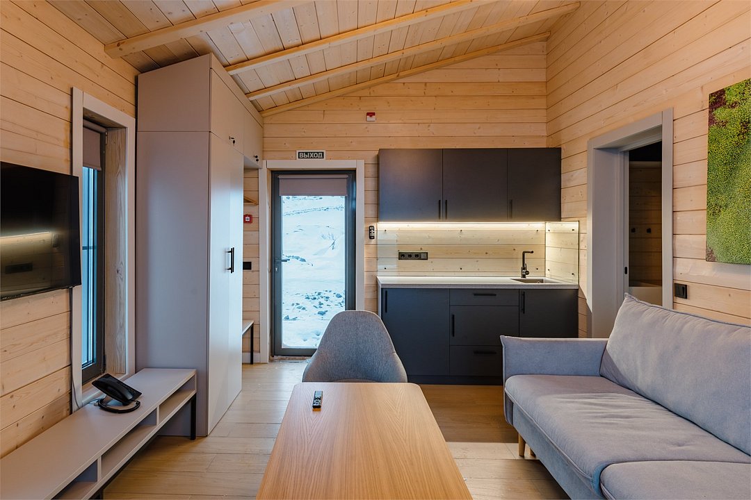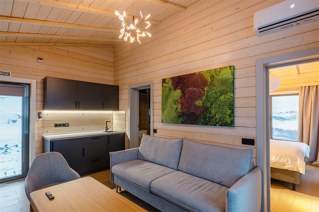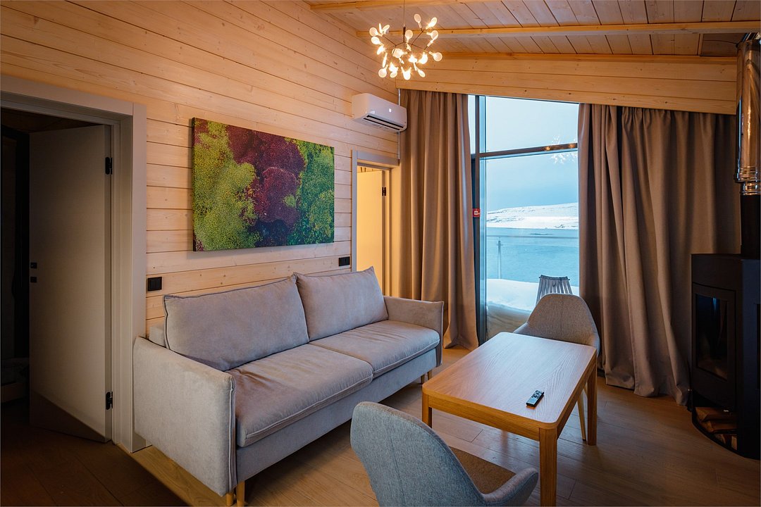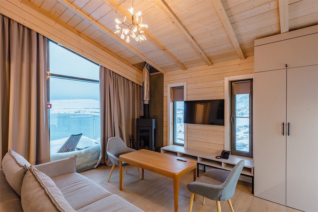 Приватные дома возвышаются на скалах Муста-Тунтури, открывая для гостей панораму Баренцева моря. Панорамное остекление, экологичные материалы, природные фактуры, лаконичный дизайн в скандинавском стиле, и камин создают ощущение уюта и спокойствия. А открытая терраса, удобная мебель, наличие полноценной кухни и плазменной панели призваны сделать ваш отдых на краю земли комфортным как в городе. В коттеджах: • Wi-Fi; • гостиная-кухня с камином и панорамными окнами; • спальня с двухспальной кроватью; • раскладной диван; • ванная комната с душевой кабиной; • терраса с уличной мебелью.Услуги и удобства
