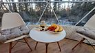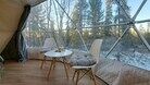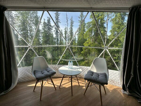 Шатёр снабжён панорамным окном, которое при необходимости можно завесить плотными шторами. Электрическое отопление (тёплый пол) и трёхслойное утепление стенок шатра позволяют поддерживать в нем комфортную температуру в любое время года. Рядом с шатром расположена терраса, где располагаются столик и кресла.