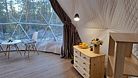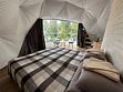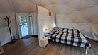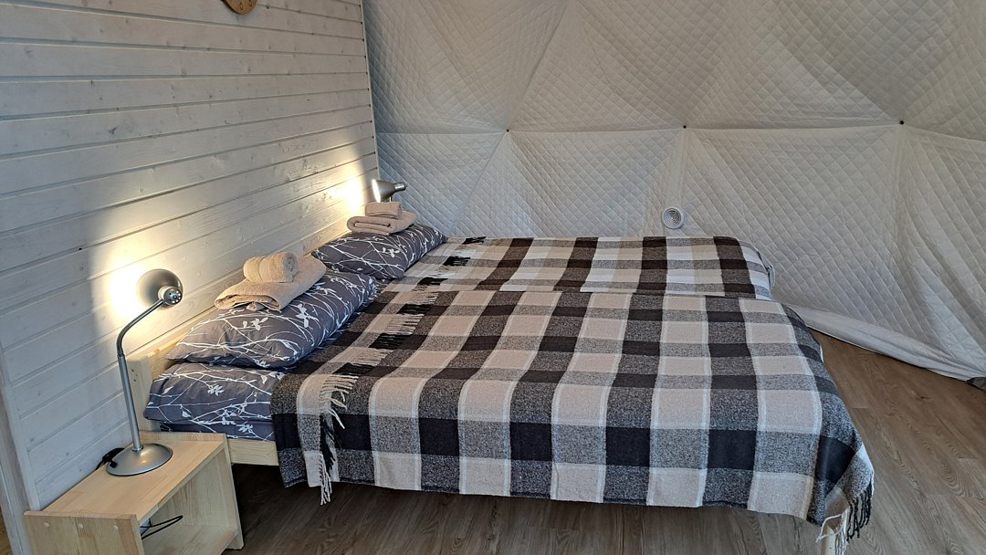 Электрическое отопление (тёплый пол), кондиционер и трёхслойное утепление стенок шатра позволяют поддерживать в нем комфортную температуру в любое время года. В эко-шатре есть ванная комната с душем и бесплатными туалетно-косметическими принадлежностями. Площадь 28 м2, рассчитан на комфортное размещение до 2 человек.