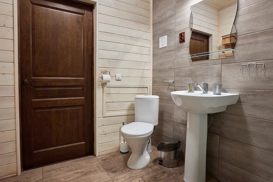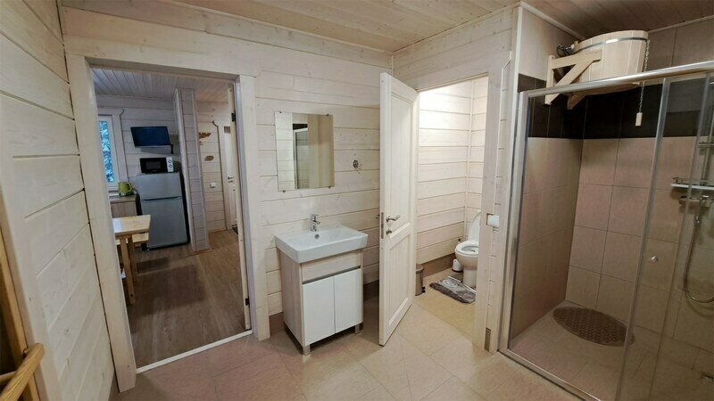 Домик построены из экологически чистого материала, хорошо отапливается, есть горячее водоснабжение. В домике есть ванная комната с душем и бесплатными туалетно-косметическими принадлежностями.