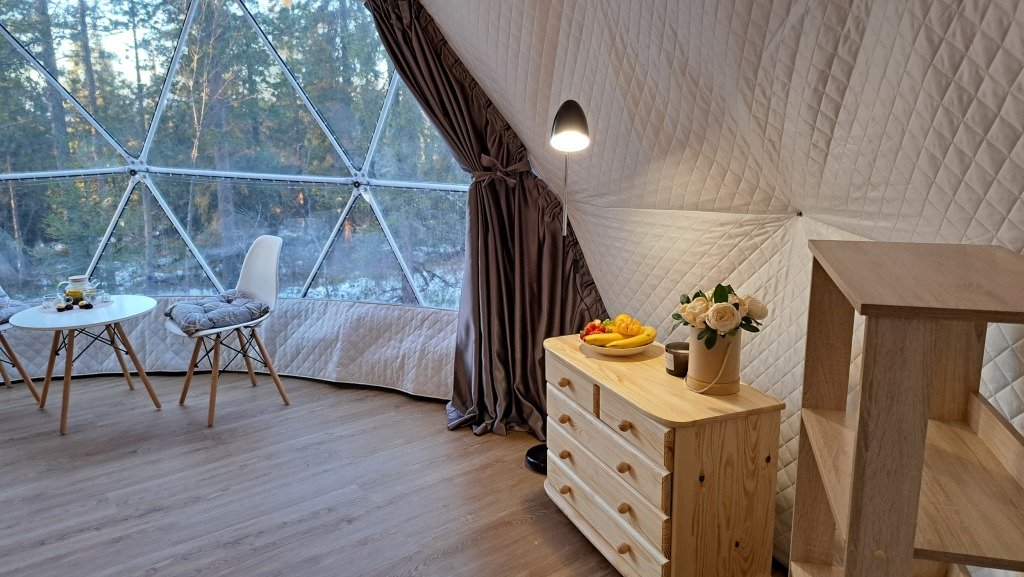 Утепленный эко-шатёр диаметром 6м с большим панорамным окном, которое при необходимости можно завесить плотными шторами.