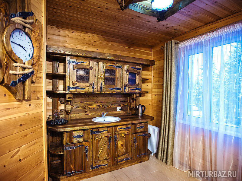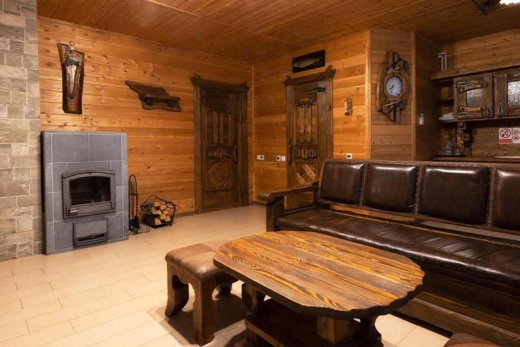 В двухэтажных домах предусмотрена уютная гостиная с настоящим камином на дровах, мягкая мебель, буфет и широкоформатные телевизоры со спутниковым телевидением. На втором этаже располагаются две спальни.