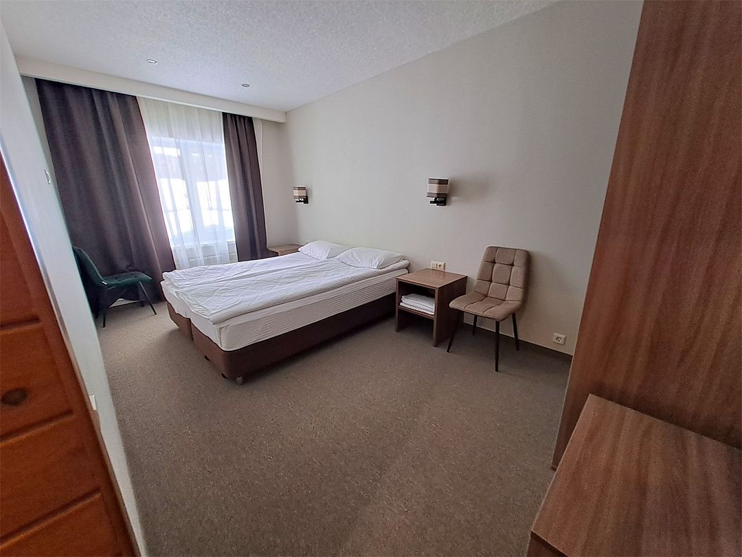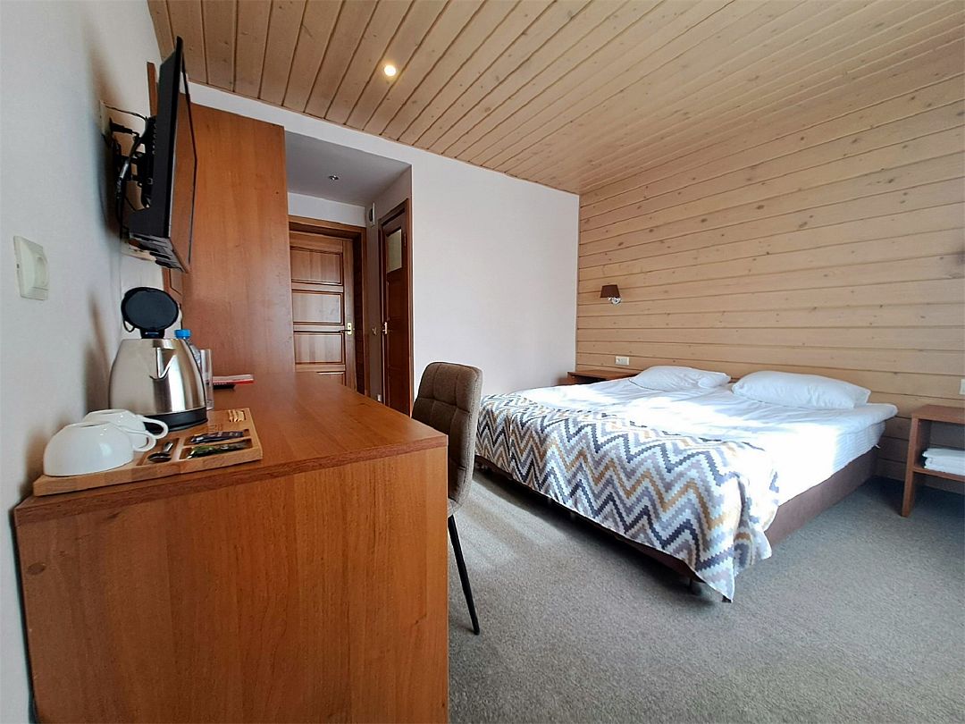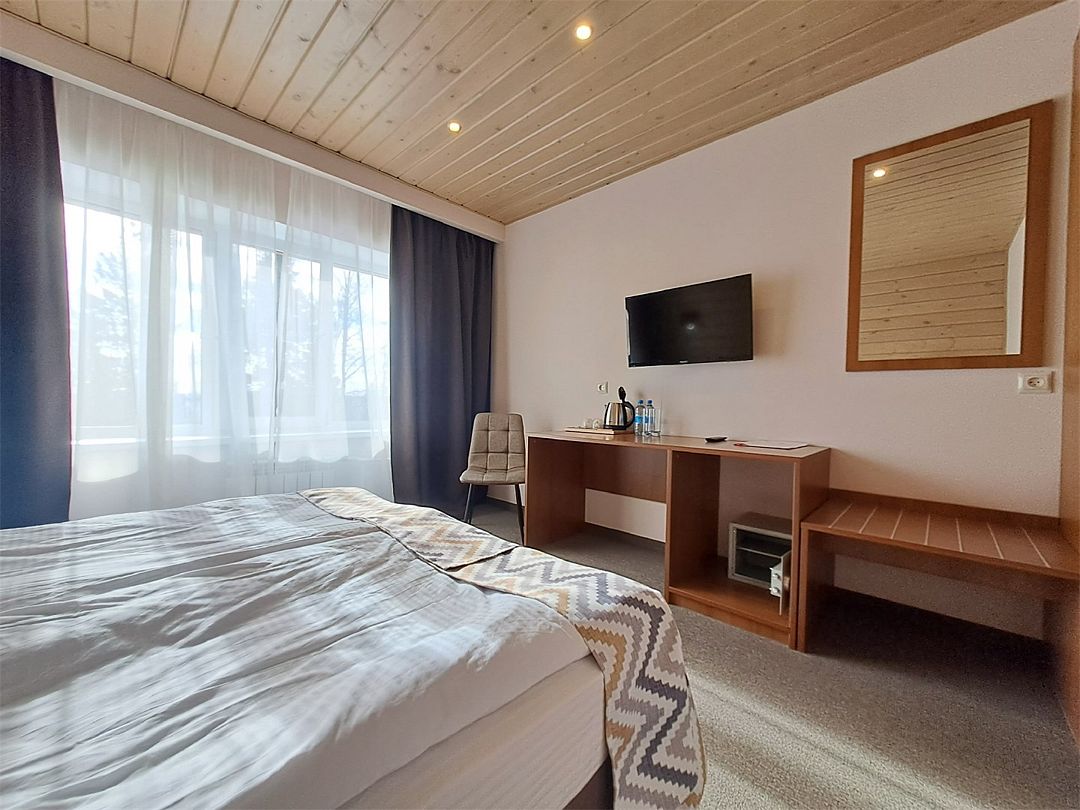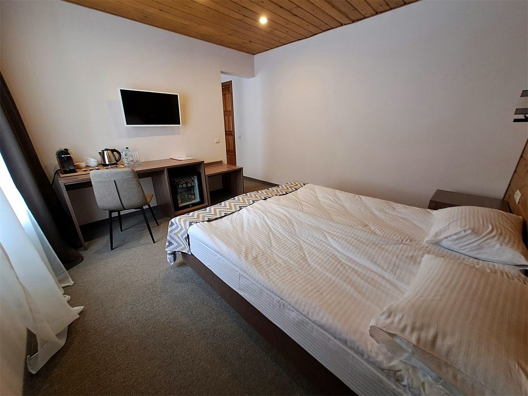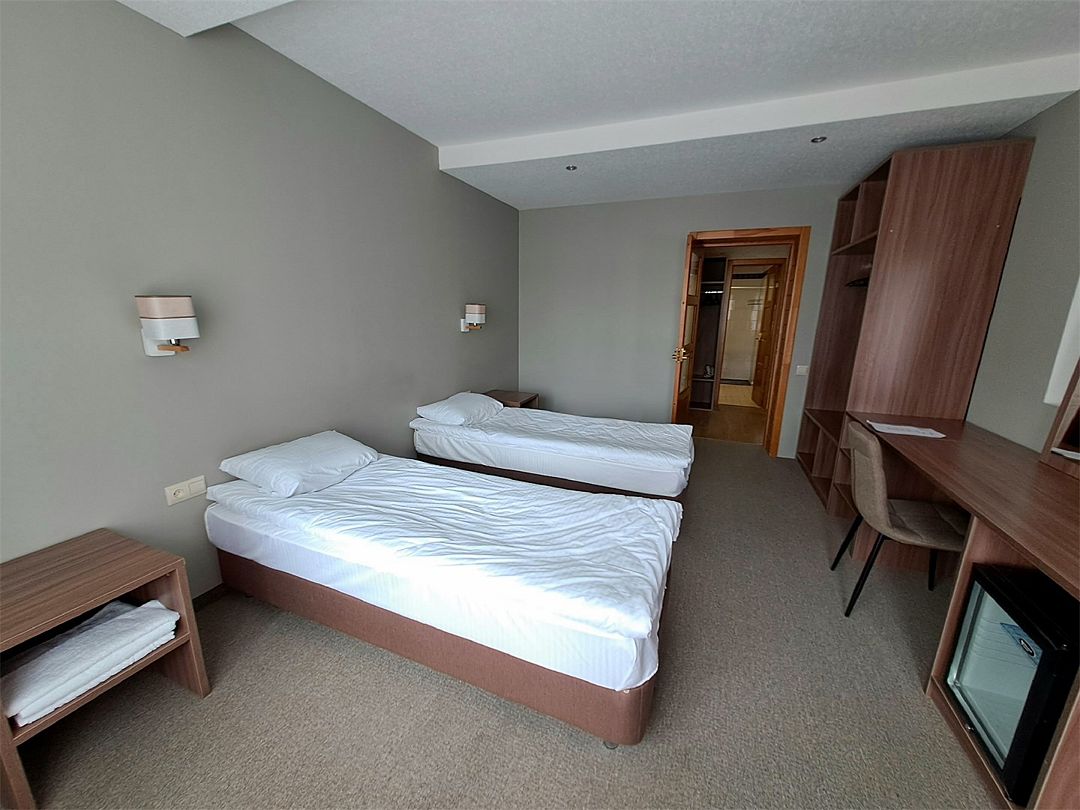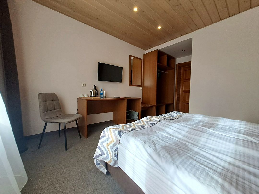 Уютный стандартный номер с одной двуспальной кроватью или двумя односпальными. В номере есть все для комфортного проживания: ортопедический матрас, телевизор, туалет с душем, сейф, чайная станция, банные халаты, душевые принадлежности, одноразовые тапочки, wi-fi.