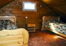 2 двухместные спальные комнаты в шестиместном коттедже, 2 кровати с тумбочкой на мансарде, гостиная с камином, мягким уголком, платяным шкафом, умывальником, застеклённая веранда, постельное бельё, полотенца, тапочки входят в стоимость проживания.