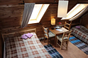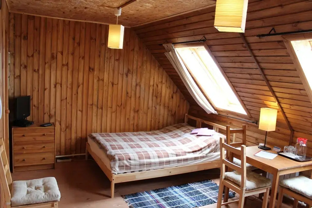 Комнаты в доме 2-х и 3-х местные, одна – 5-ти местная, оборудованы двух и односпальными кроватями, комодами для личных вещей, вешалками для одежды, столами, стульями и табуретами в соответствии с количеством отдыхающих. Имеется общее верхнее и местное освещение, электрические розетки для неэнергоемких электрических приборов. Отопление в комнатах – централизованное, в пятиместной комнате дополнительно установлен камин.