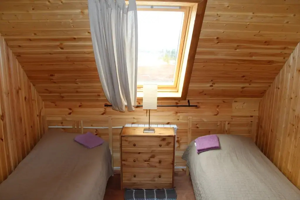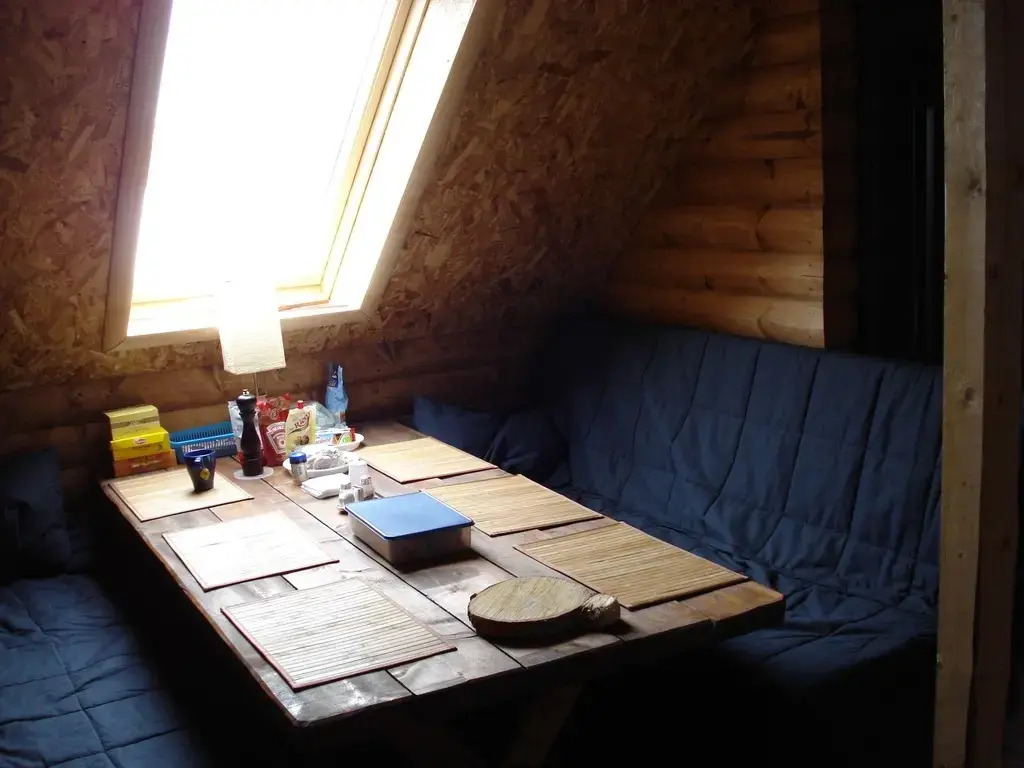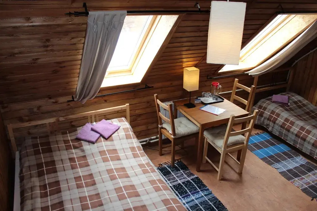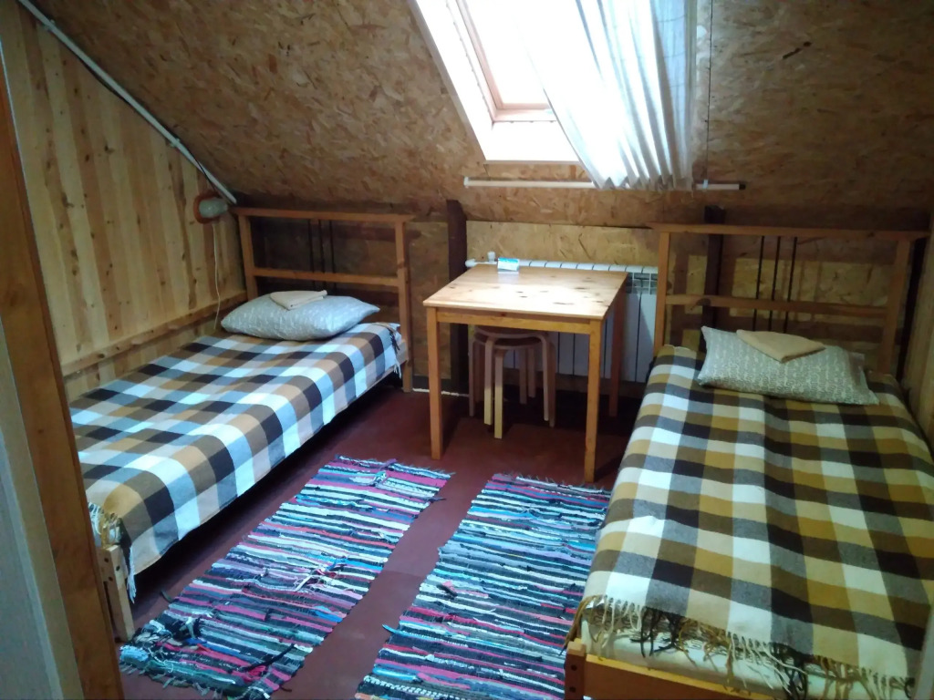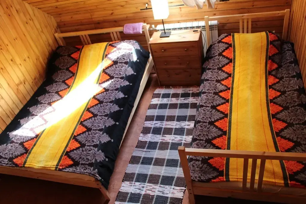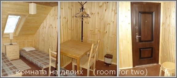 Малый гостевой дом, два этажа, две комнаты на 6 - 8 человек. Оборудованные двух и односпальными кроватями, комодами для личных вещей, вешалками для одежды, столами, стульями. Имеется санузел на первом этаже. Отопление дома печное (камин).