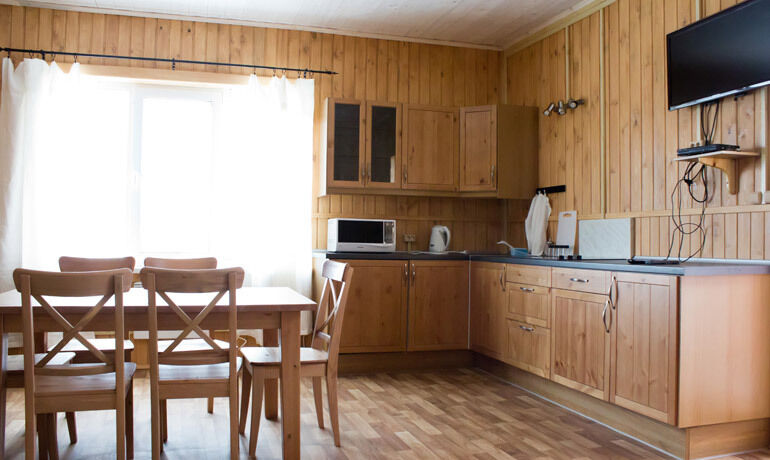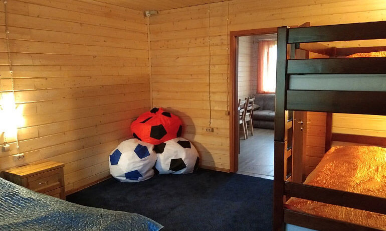 Номер для Вашей семьи с большой двуспальной и детской двухярусной кроватями. Есть своя небольшая кухня, где можно готовить. 2 дополнительных спальных места расположены на раскладном диване.