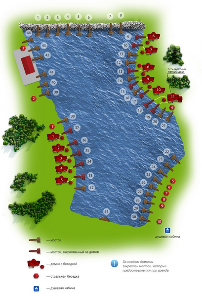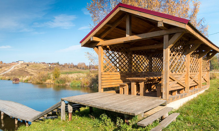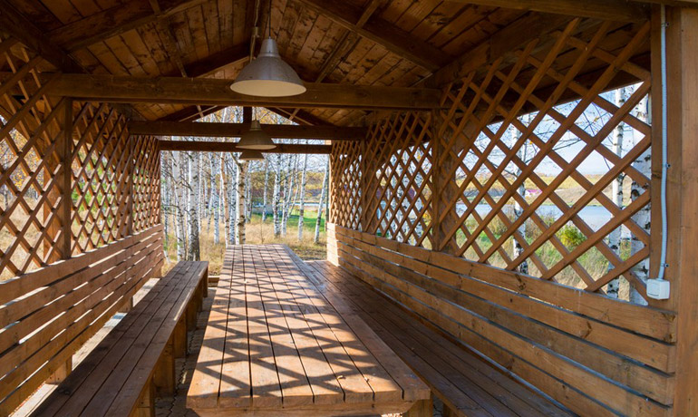 Все озера клуба оборудованы уютными беседками. Малые рассчитаны на 4-6 человек, большие корпоративные вмещают до 20 гостей. Все беседки оснащены мангалами, местами для костров и сдаются на день.