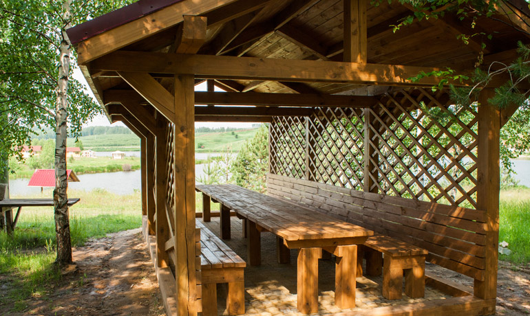 Уютные беседки на берегу озера на 6 и 20 человек.