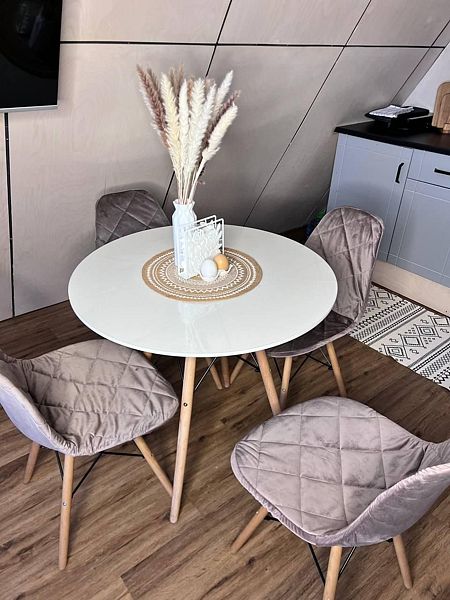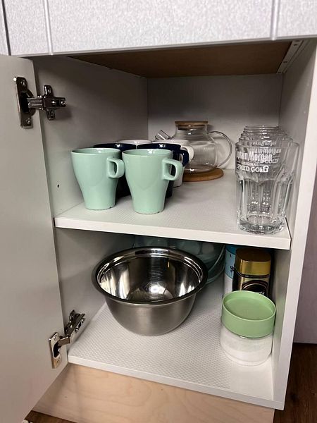 Кухня оборудована бытовой техникой, чтобы гости смогли приготовить любимые блюда. Есть плита, холодильник, чайник, микроволновая печь, а также необходимый набор посуды.