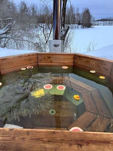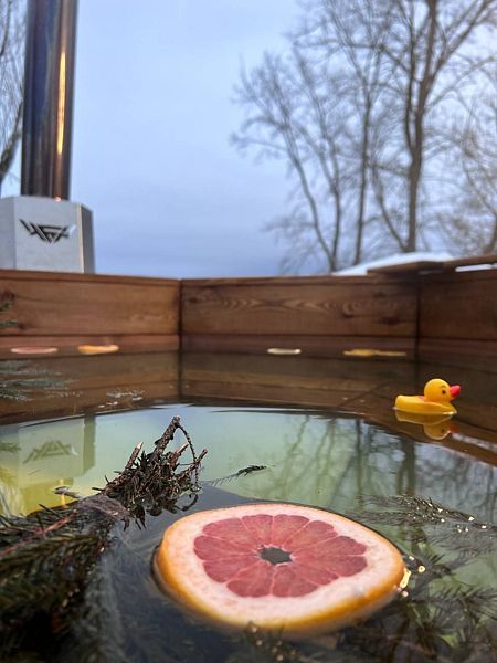 На прилегающей территории обустроена мангальная зона, а уголь и розжиг можно приобрести на месте. Расслабиться можно в банном чане на открытом воздухе.
