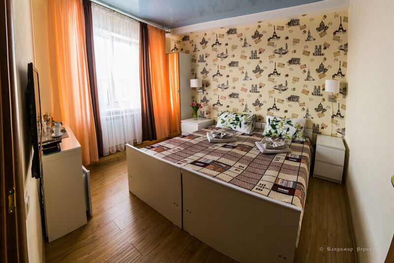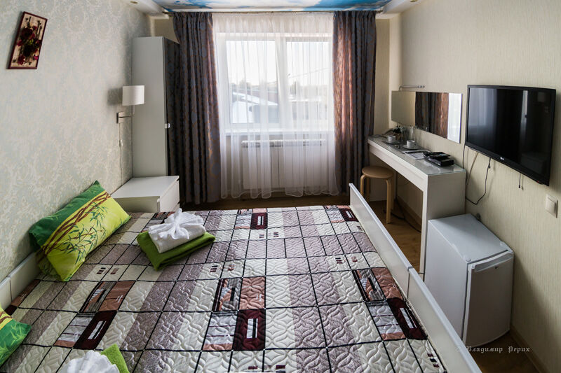 В каждом номере есть большая двухспальная кровать (160х200) или 2 односпальных (по запросу), спутниковое телевидение, бесплатный Wi-Fi, электрический чайник, посуда, мини-холодильник, сейф, туалет, душ, фен.