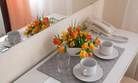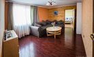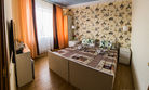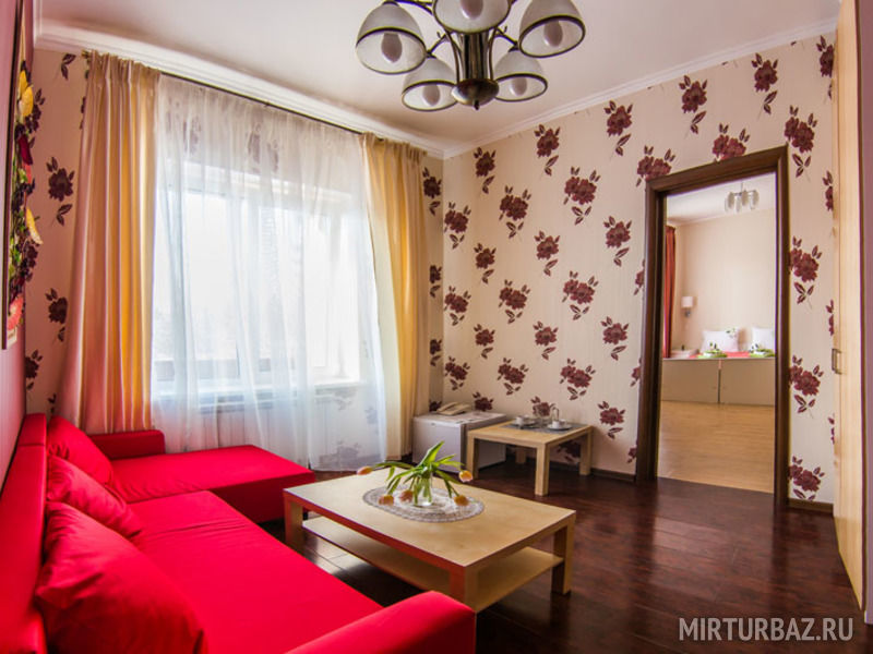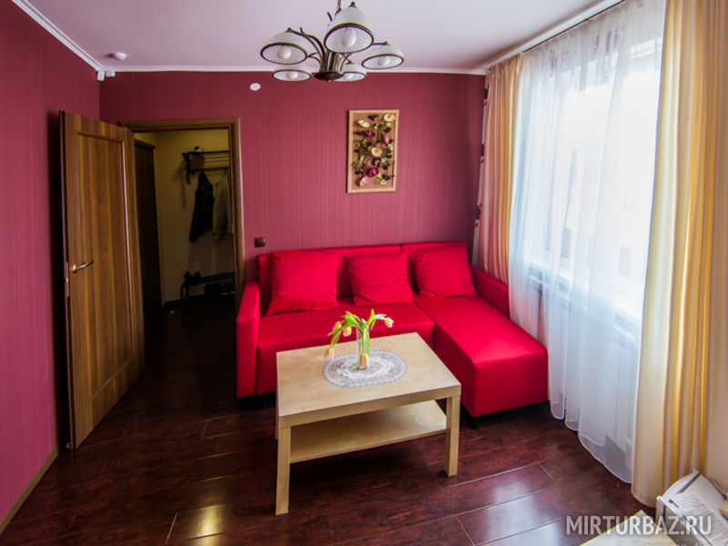 Номер состоит из спальни, гостиной, прихожей и ванной комнаты с туалетом и душем. В спальне большая двуспальная кровать, в гостиной стоит раскладной диван-кровать. Всего номер может вместить до 4-х человек, включая детей (+1 ребенок до 3-х лет)