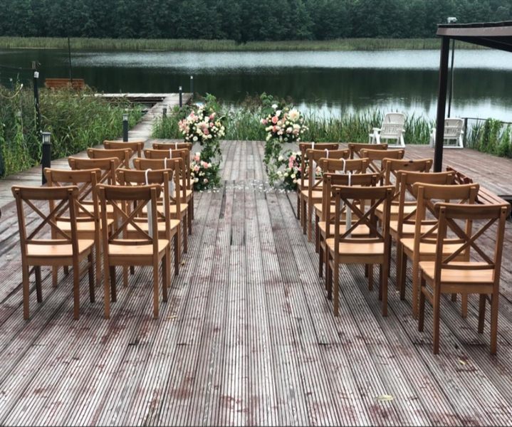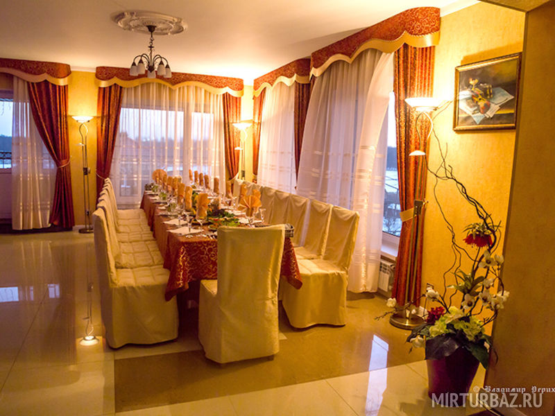 Для проведения свадьбы мы можем предложить Вам в аренду несколько помещений - это банкетный зал на втором этаже главного корпуса, рассчитанный на 35 человек с местом для танцев, большим балконом выходящим на озеро, камином и караоке.