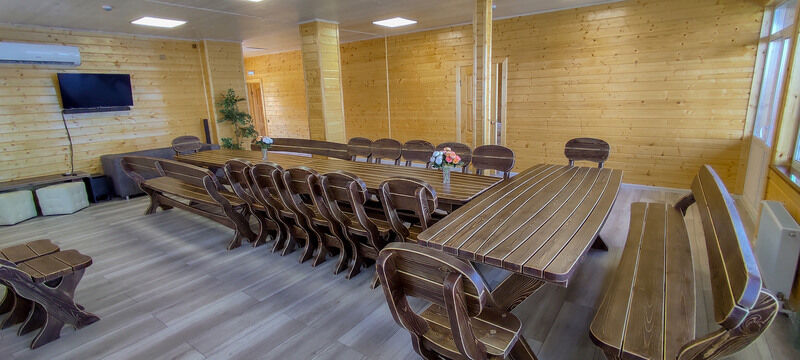 Дубовая беседка с мангалом и водопроводом вместимостью до 30 гостей.