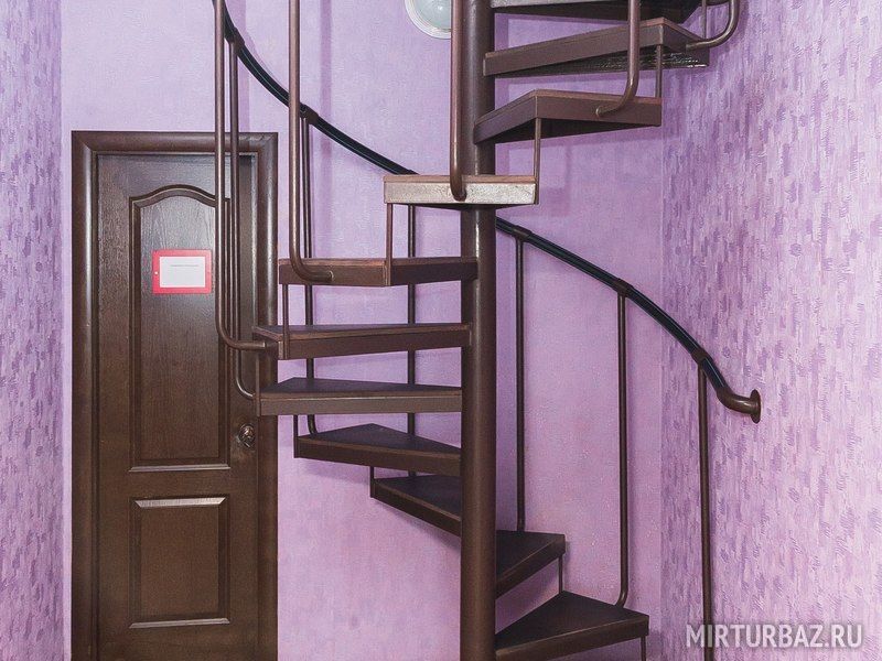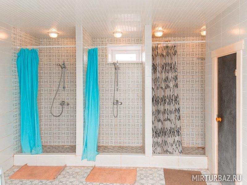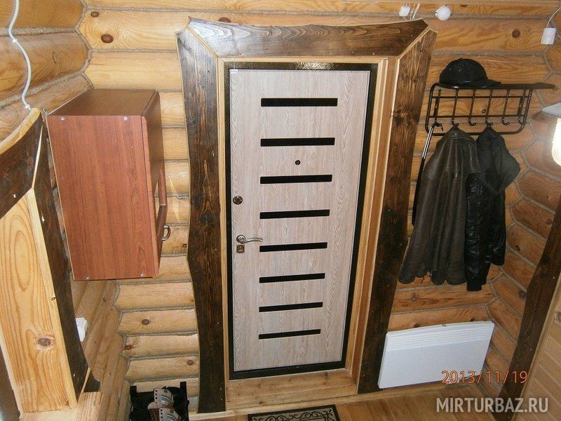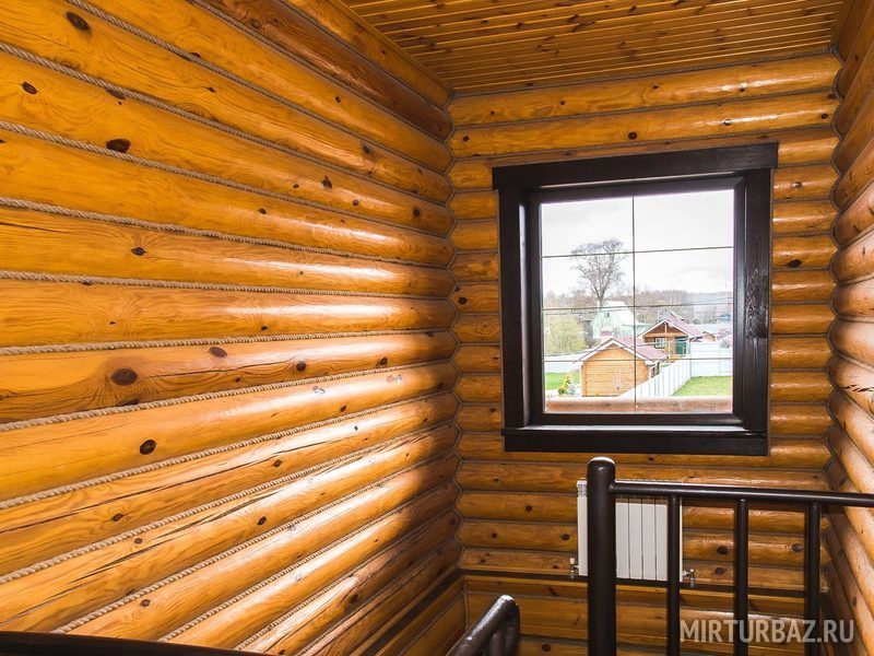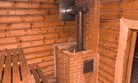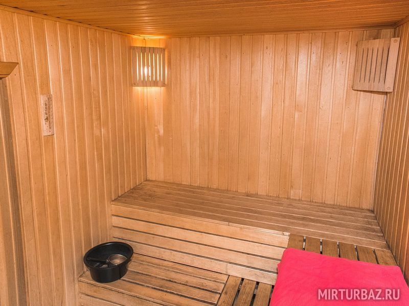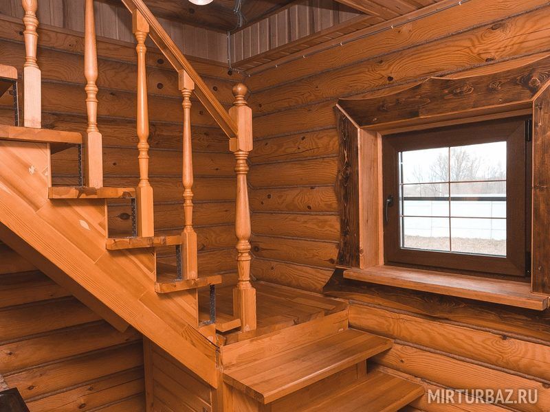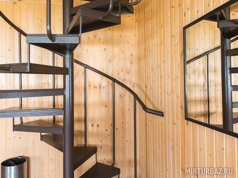 Пологи постелены из дерева абаш, которое не нагревается и соответственно не обжигает тело. Кроме парной, на первом этаже есть помывочная с душем, туалет, небольшая прихожая и кухня.