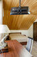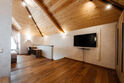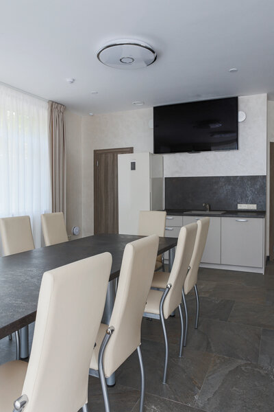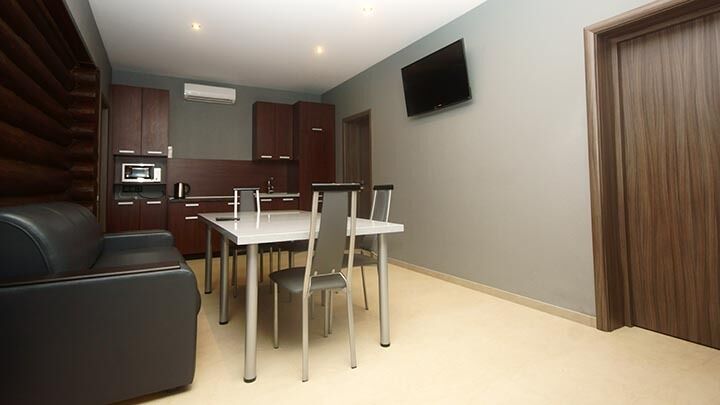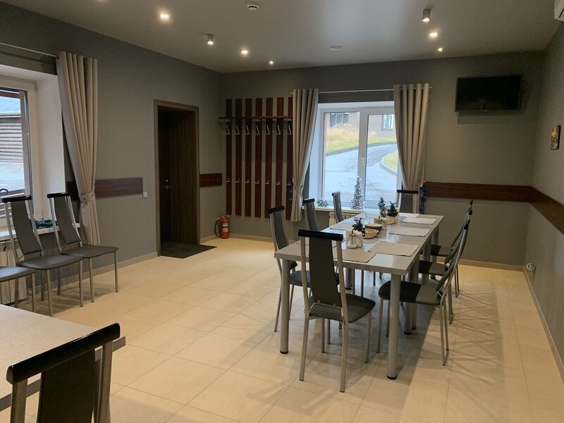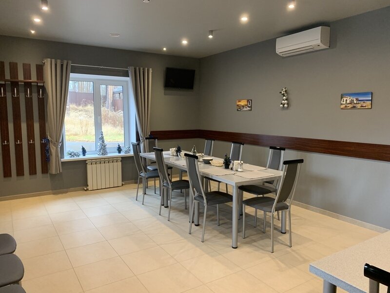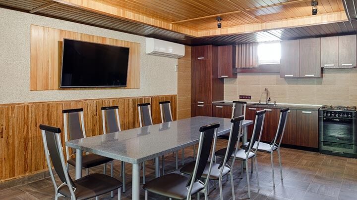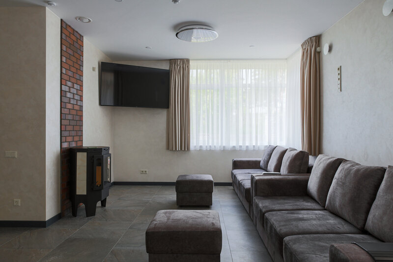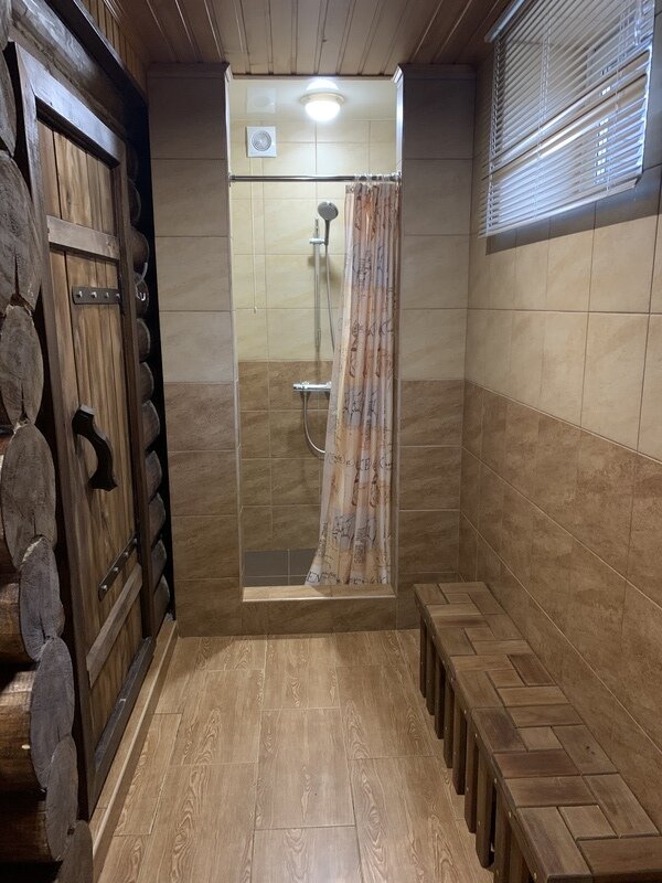 Прямо в коттедже находится баня на дровах (оплачивается дополнительно 1800 рублей час, заказ минимум 3 часа), ванная комната с туалетом, гостиная совмещенная с кухней. По центру гостиной большой обеденный стол, диван, напротив которого телевизор с цифровым сигналом — 20 эфирных каналов с идеальной картинкой. Кухня оборудована холодильником, микроволновой печью, чайником, набором посуды и столовых приборов.