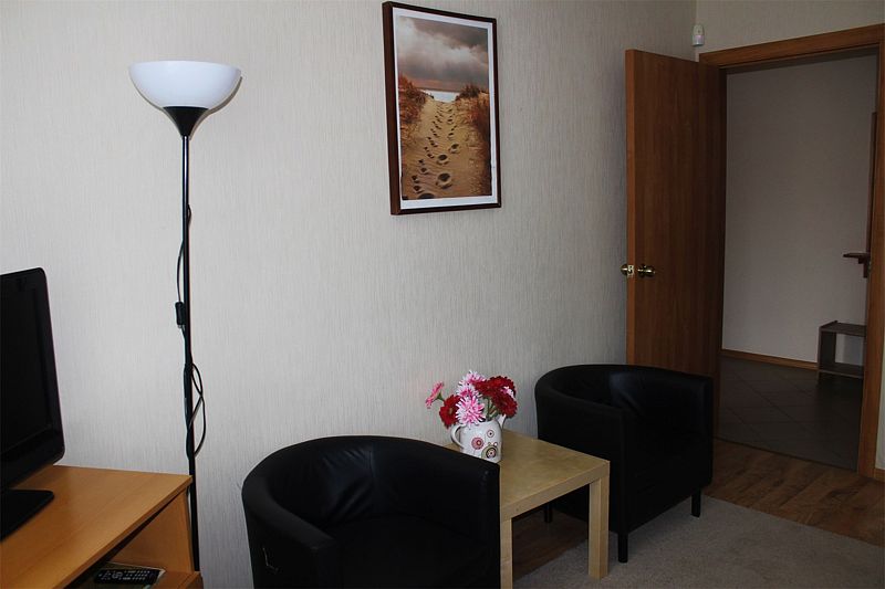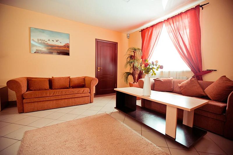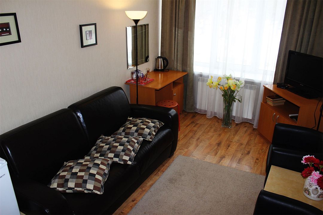 Двухкомнатный номер в основном корпусе - спальная комната с двуспальной кроватью, гостиная комната с мягкой мебелью, телевизором, письменным столом и холодильником.