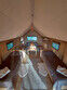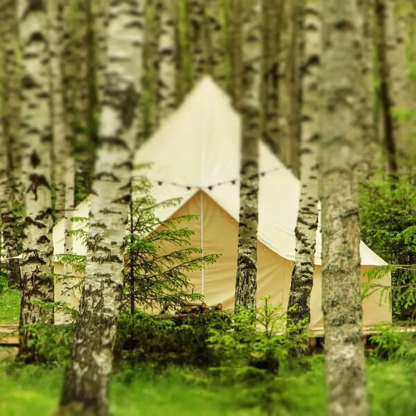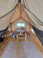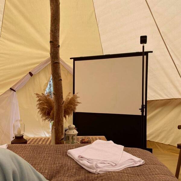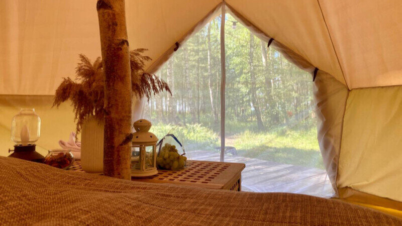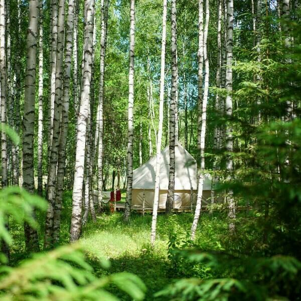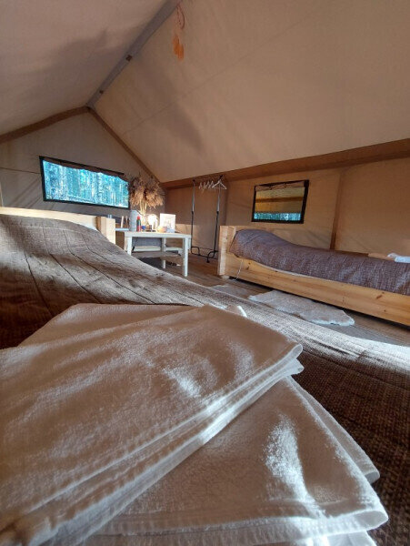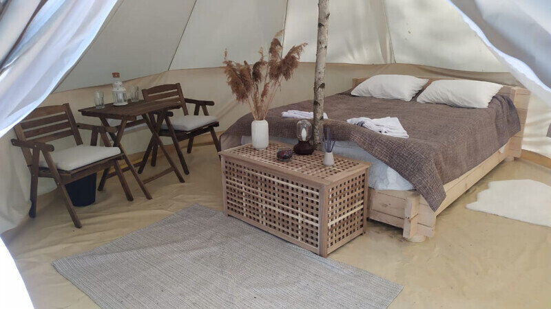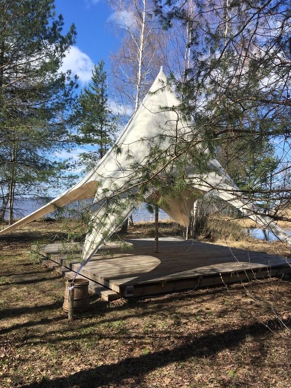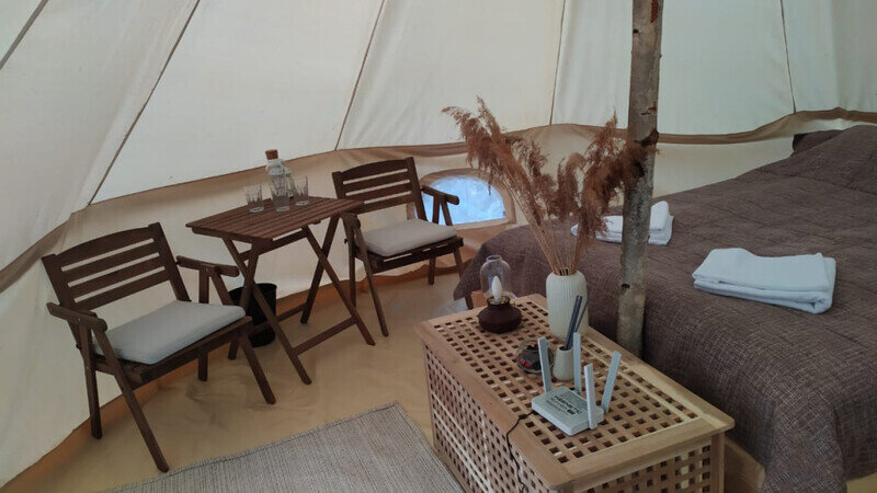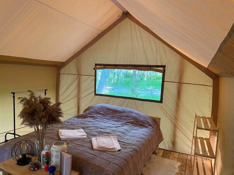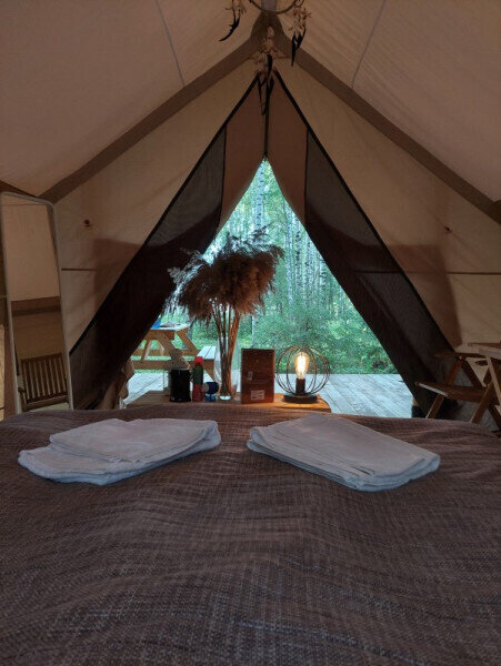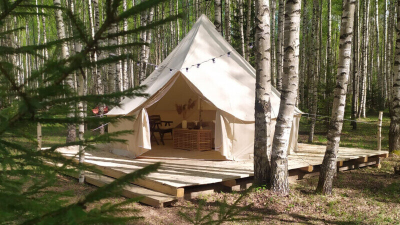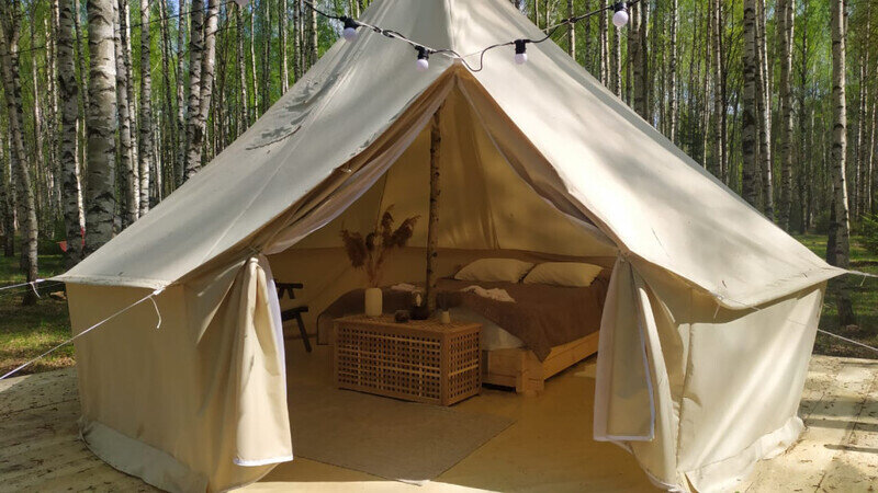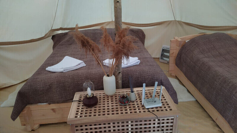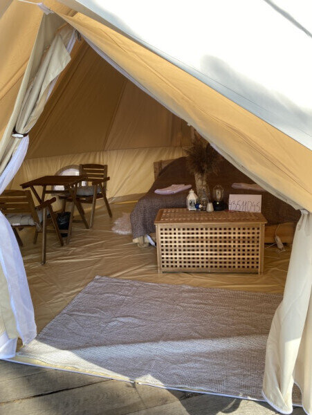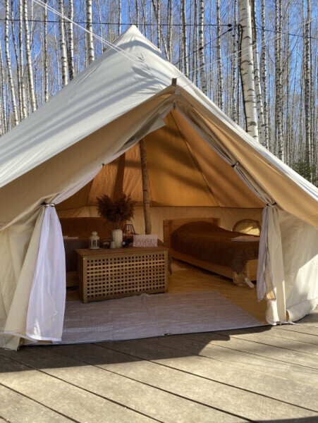 Размещение организовано в стильных шатрах типа «Bell Tent». Они выполнены из натуральных дышащих материалов, хорошо сохраняющих тепло и обеспечивающих комфорт в любую погоду. Каждый шатёр рассчитан на проживание двух-трёх человек. Внутри — электричество и освещение, а рядом установлены мангалы с решётками.