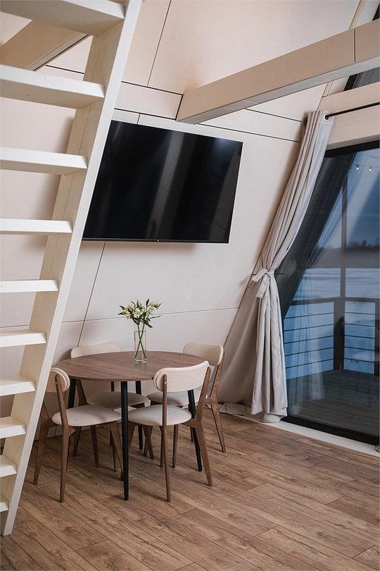 телевизор, Wi-Fi, кондиционер, фен, плита для приготовления пищи, микроволновая печь, обогреватель, душевая кабина, водонагреватель, теплый пол, банные полотенца, гигиенические средства, терраса, двуспальная кровать, обеденный стол, комод, душ, вид на реку, туалет, панорамные окна, раскладной диван, мини-холодильник, телевизор со Smart TV, двуспальный раскладной диван-кровать, мыло, можно с питомцамиВ домике