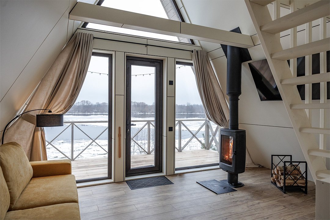 телевизор, Wi-Fi, кондиционер, фен, плита для приготовления пищи, микроволновая печь, обогреватель, душевая кабина, водонагреватель, теплый пол, банные полотенца, гигиенические средства, терраса, двуспальная кровать, обеденный стол, комод, камин, душ, вид на реку, туалет, панорамные окна, раскладной диван, мини-холодильник, телевизор со Smart TV, двуспальный раскладной диван-кровать, мыло, можно с питомцамиВ домике