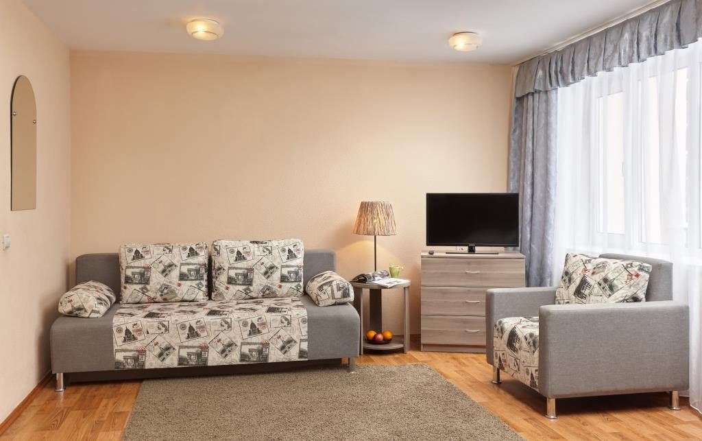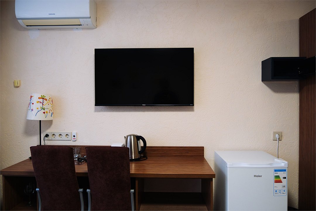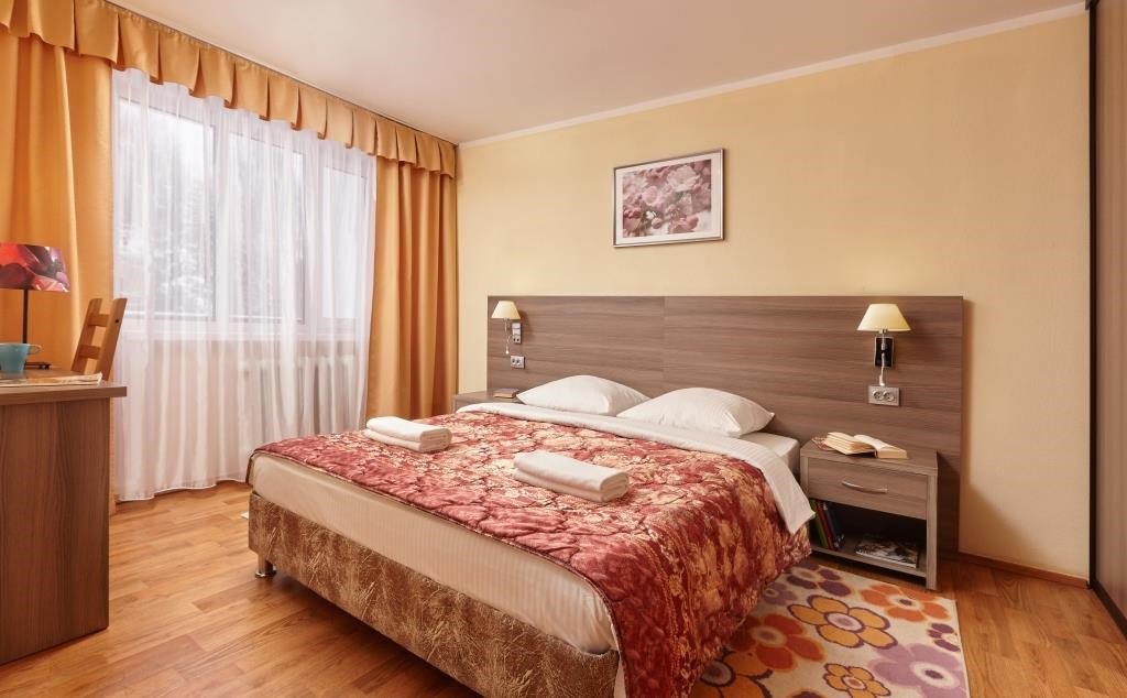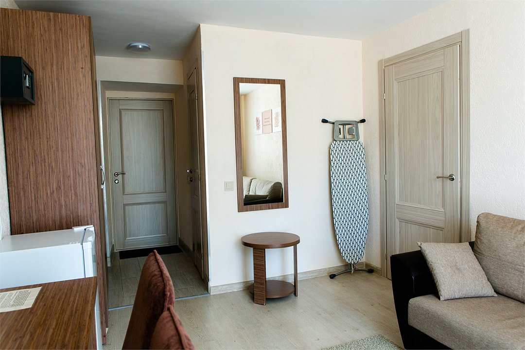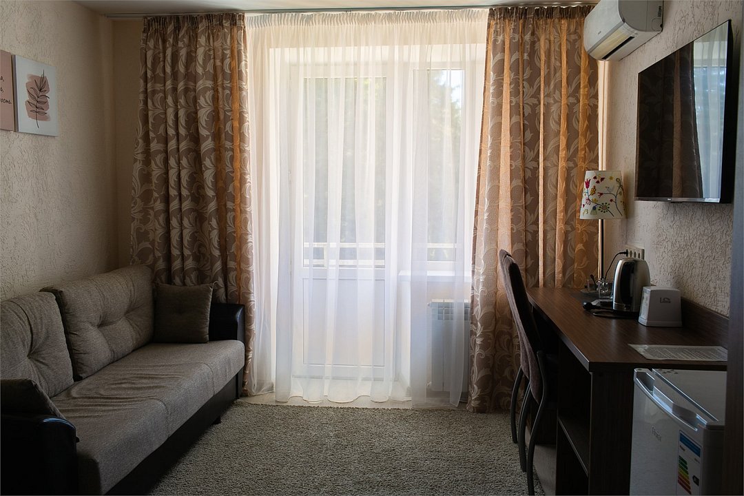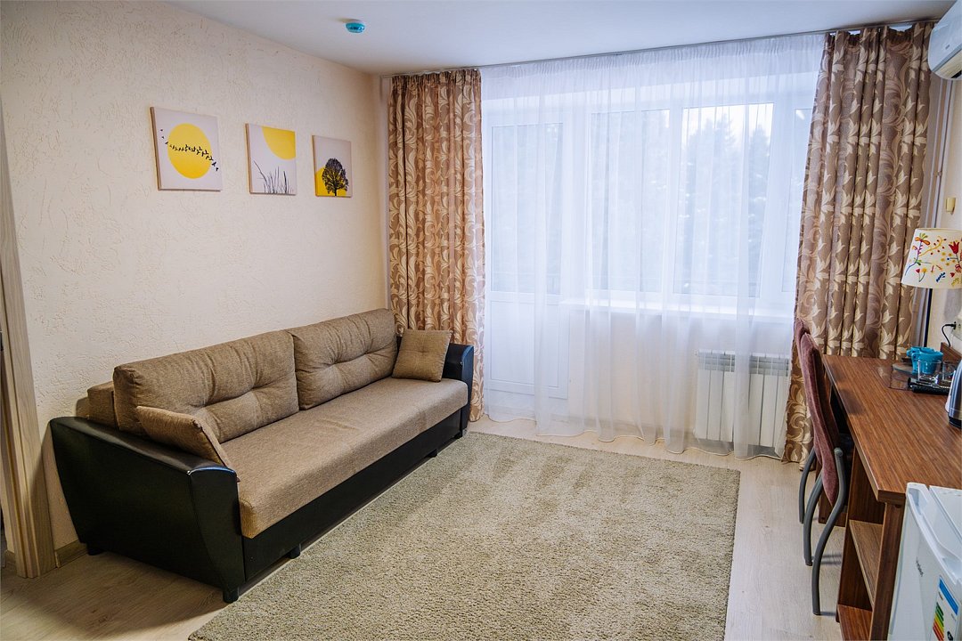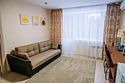 Номера категории Джуниор сюит «Комфорт» расположены в спальном корпусе №1 на третьем этаже. Смена белья один раз в три дня, влажная уборка в номере ежедневно, вынос мусора — ежедневно.