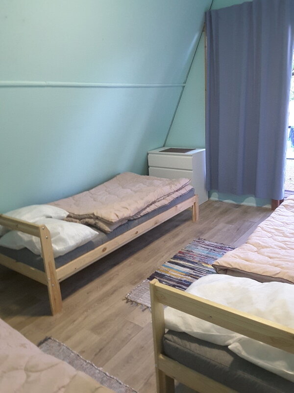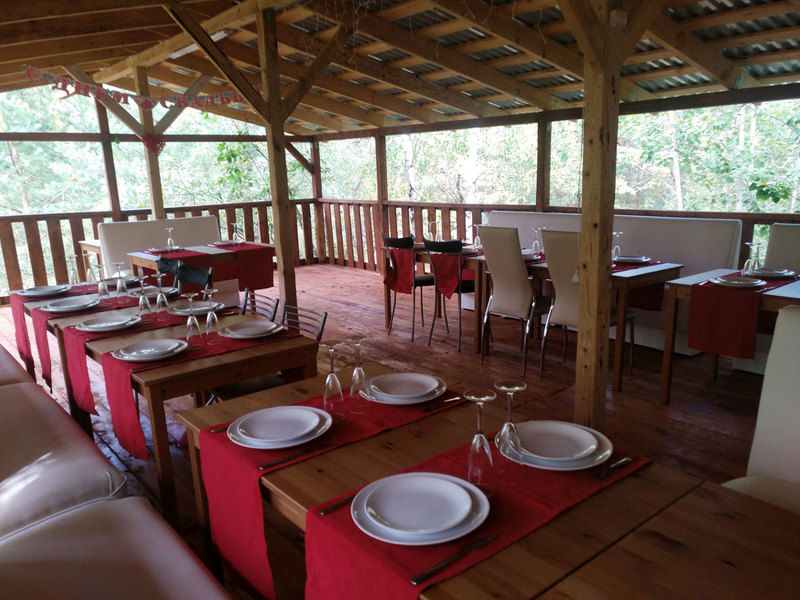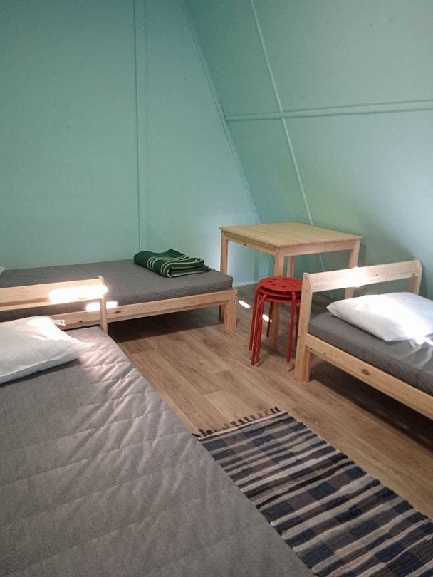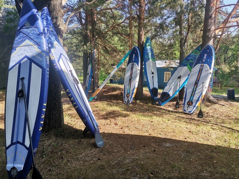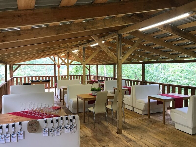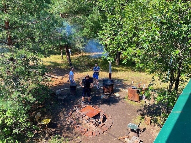 Доступно 7 домиков с возможностью размещения по 16 человек в каждом, оборудованная кухня, столовая до 70 мест, кафе до 45 мест, душ, баня и туалеты, лодки, сап-борды, настольный теннис, велосипеды, бильярд, спортивные и детские площадки, пляж, танцпол, беседки.