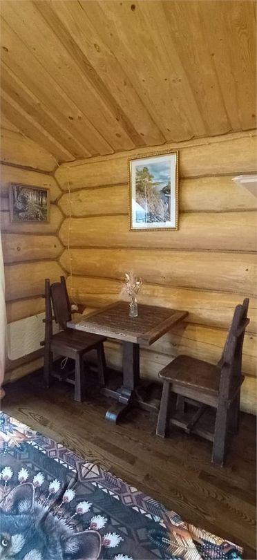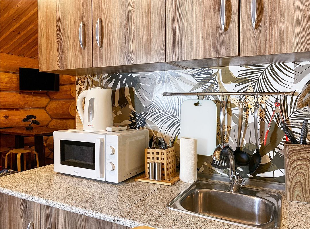 Жаркая парная с ароматом можжевелового панно, уютная комната отдыха с обеденным столом и оборудованной кухней (холодильник, микроволновая печь, набор посуды, чайник); панорамный вид; веранда и спуск к озеру; Wi-Fi.