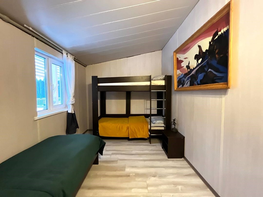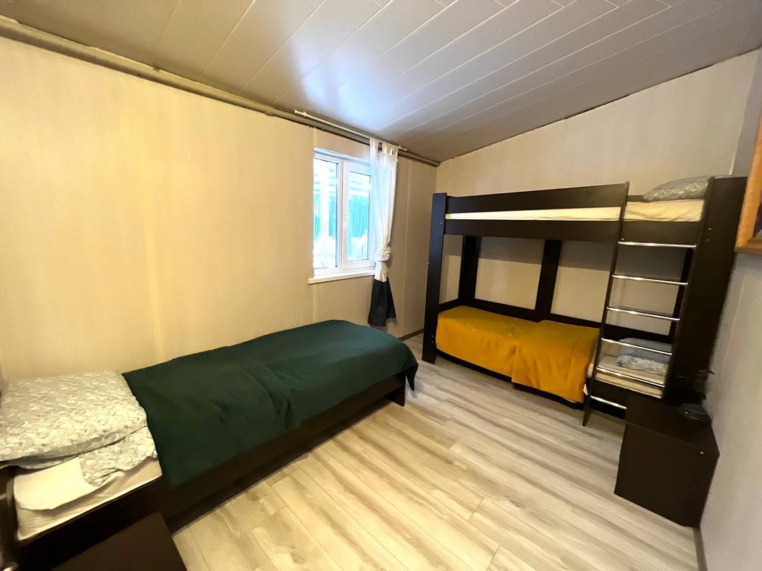 Двухкомнатный номер с двуспальной, двухъярусной и односпальной кроватями. Номер оборудован электричеством, водой, душем и туалетом.