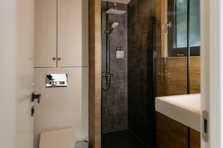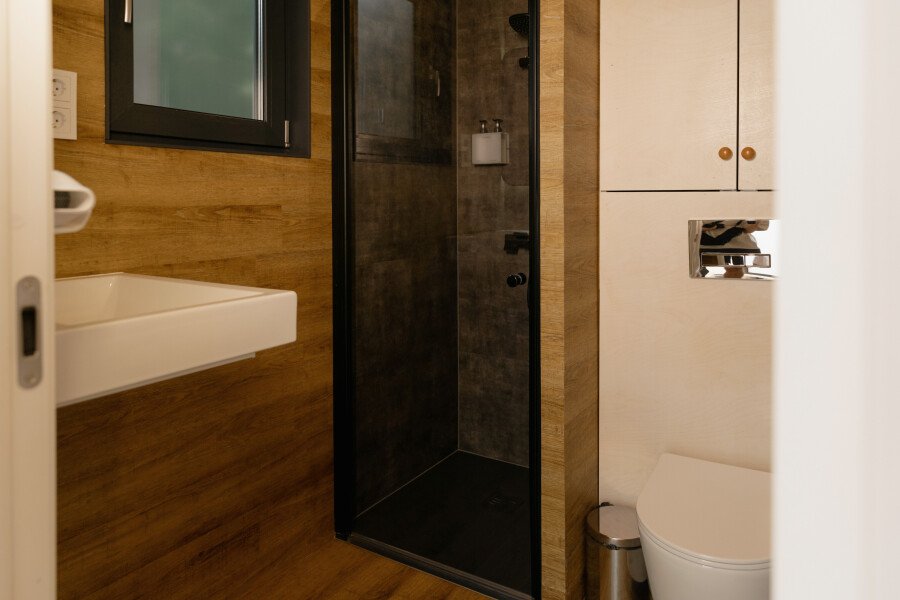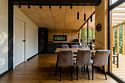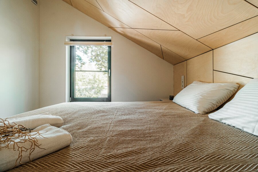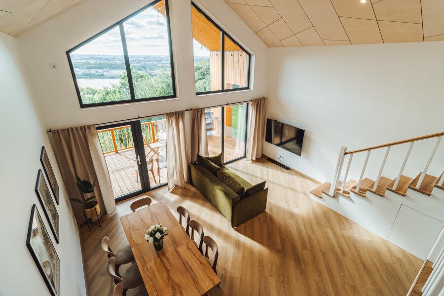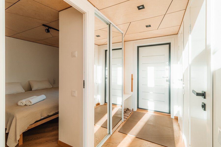 Отапливаемая площадь для проживания 41 м², веранда 15 м². Две спальни и кухня-гостиная. Шесть спальных мест (две двухспальные кровати и один диван). Одна из спален с панорамным видом на реку.