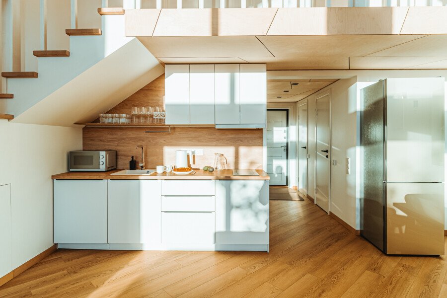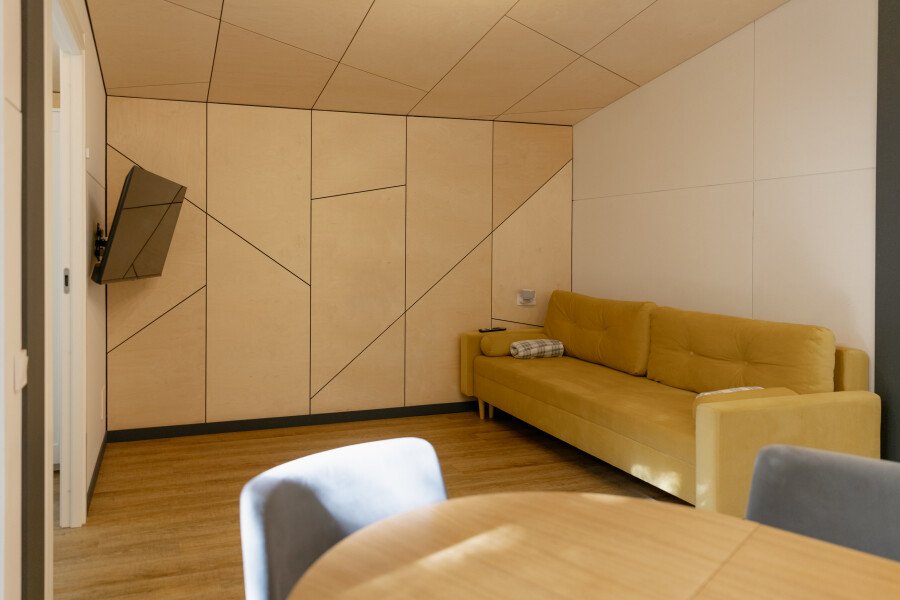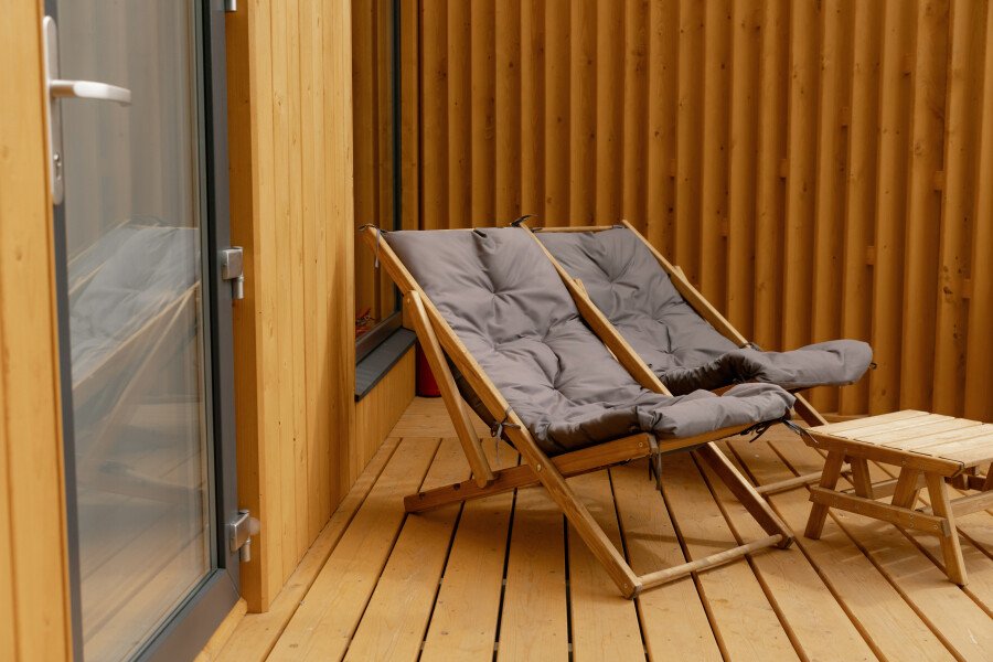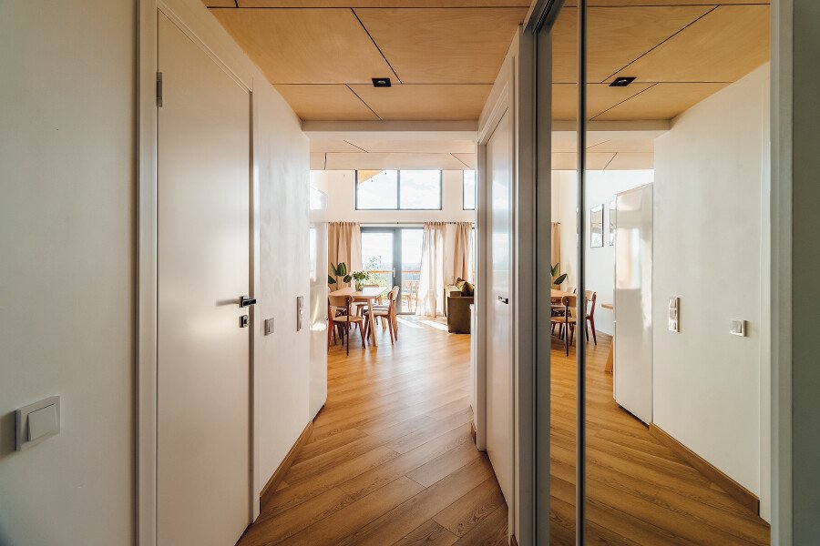 Отапливаемая площадь для проживания 71 м², терраса 18 м². Три спальни и кухня-гостиная. Восемь спальных мест (три двухспальные кровати и один диван).
