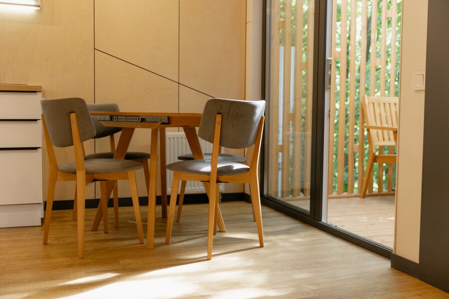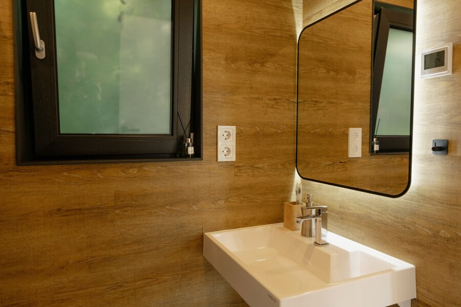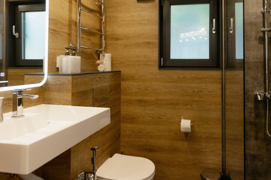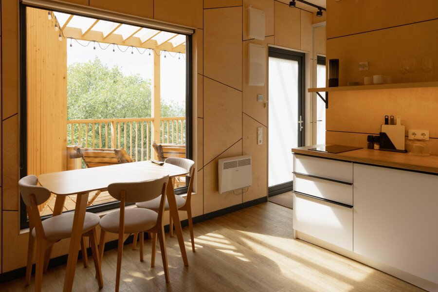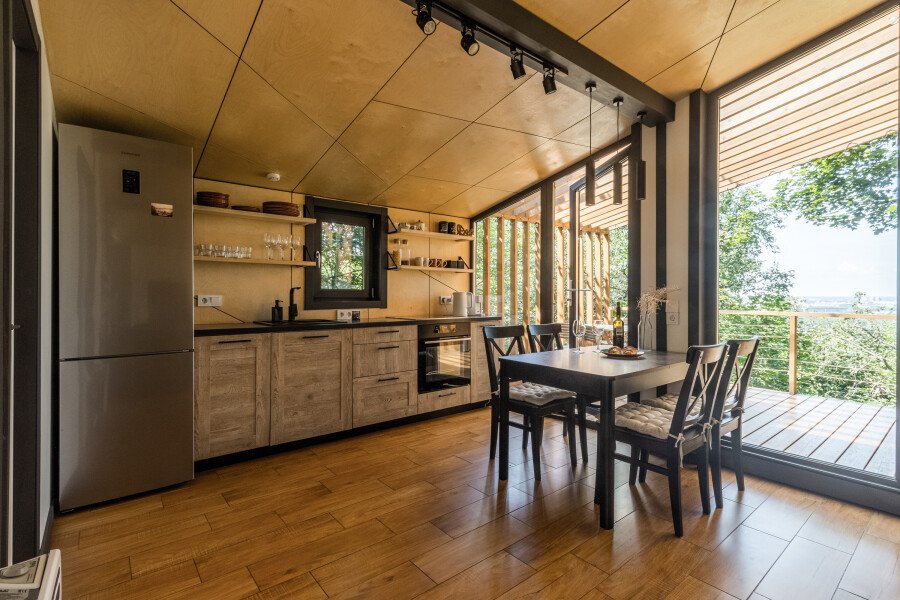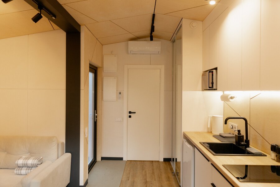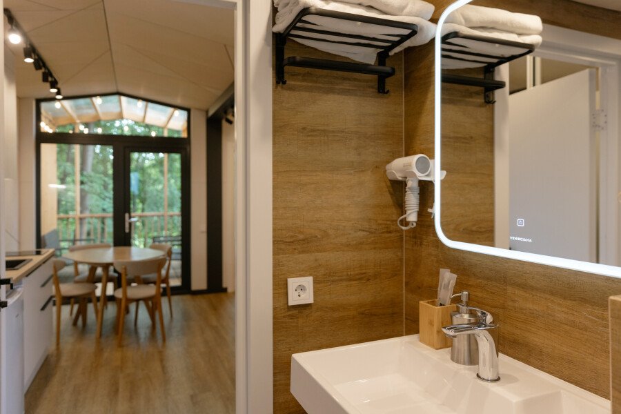 Данный домик рассчитан до четырех гостей и до двух спальных мест. В доме есть все необходимое для комфортного проживания: высокоскоростной интернет, телевизор, варочная панель, холодильник, телевизор, станция «Алиса», веранда и спальня с красивым видом и панорамными окнами, в доме теплый пол и комфортно в любую погоду.