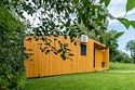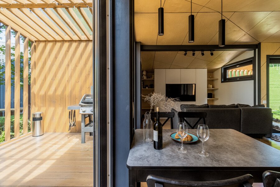 На участке газон. Отапливаемая площадь для проживания 55 м², веранда 18 м². Две спальни и кухня-гостиная. Шесть спальных мест (две двухспальные кровати и один диван). Одна из спален с панорамным окном.