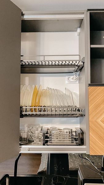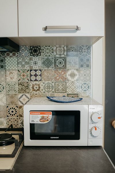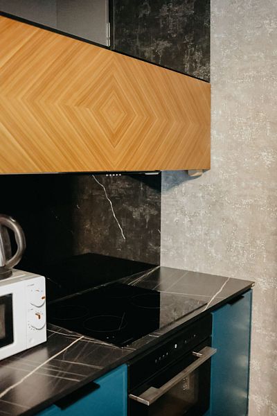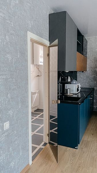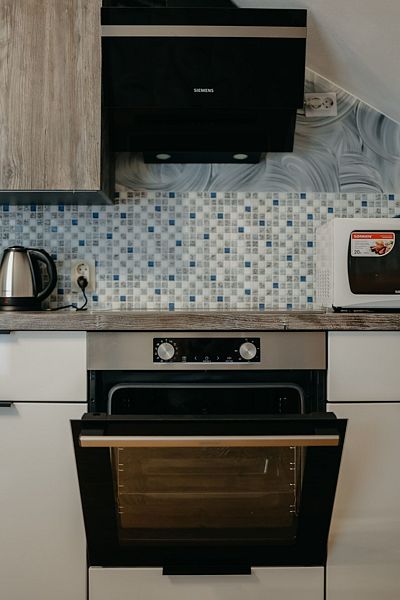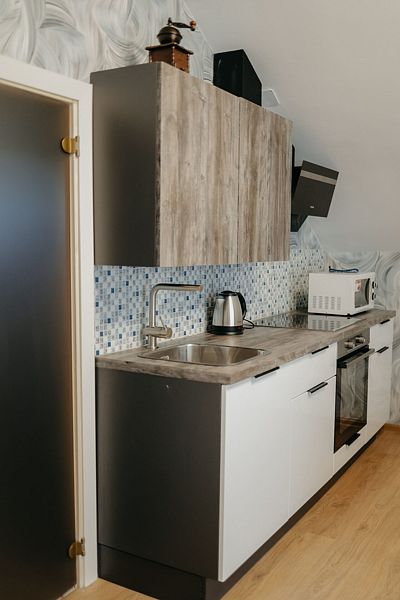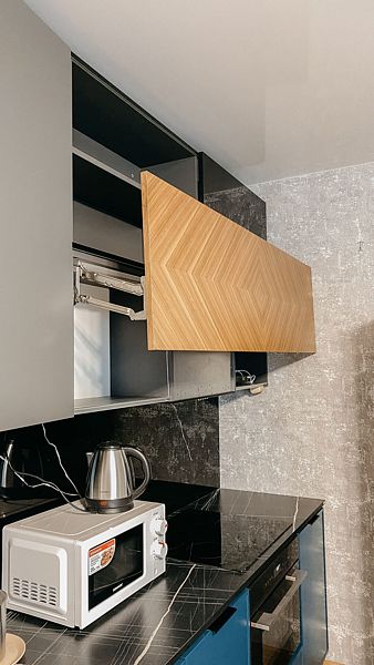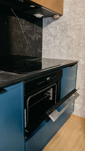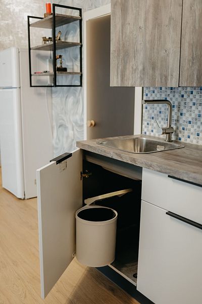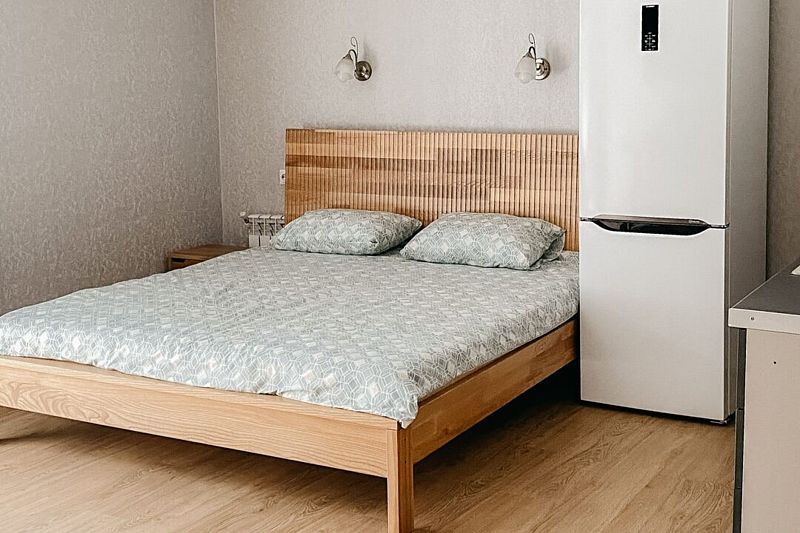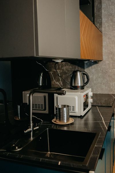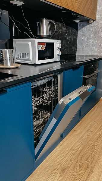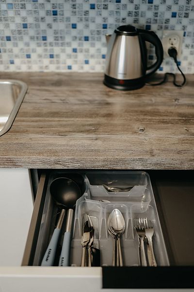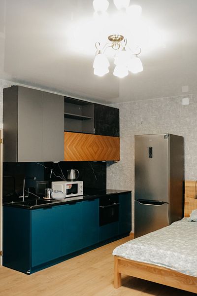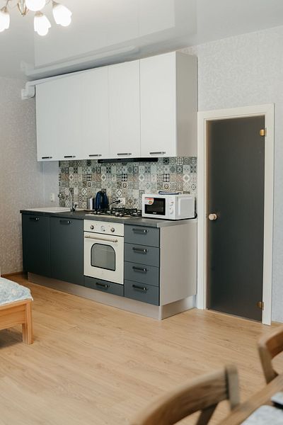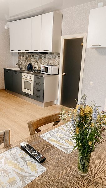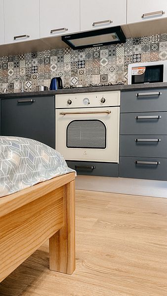 В кухонной зоне имеется все необходимое для готовки. В вашем распоряжении холодильник, варочная поверхность, набор посуды и электрический чайник.