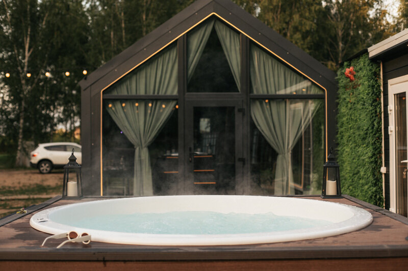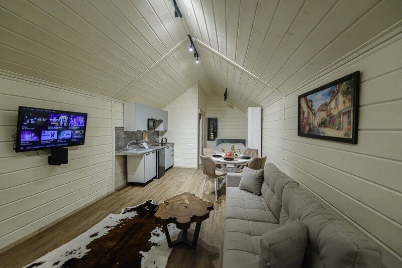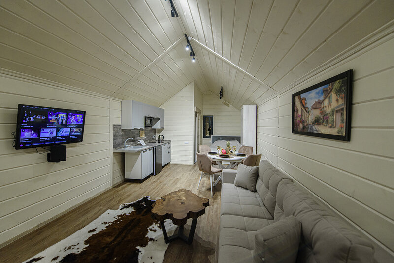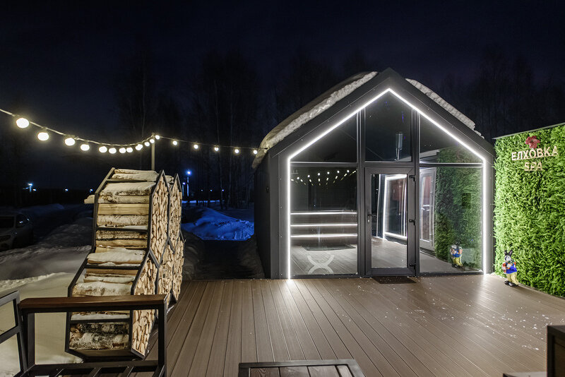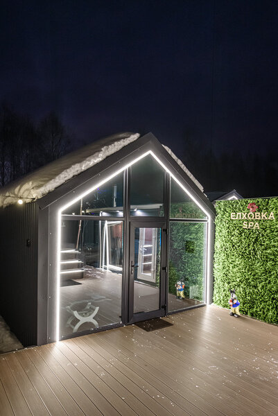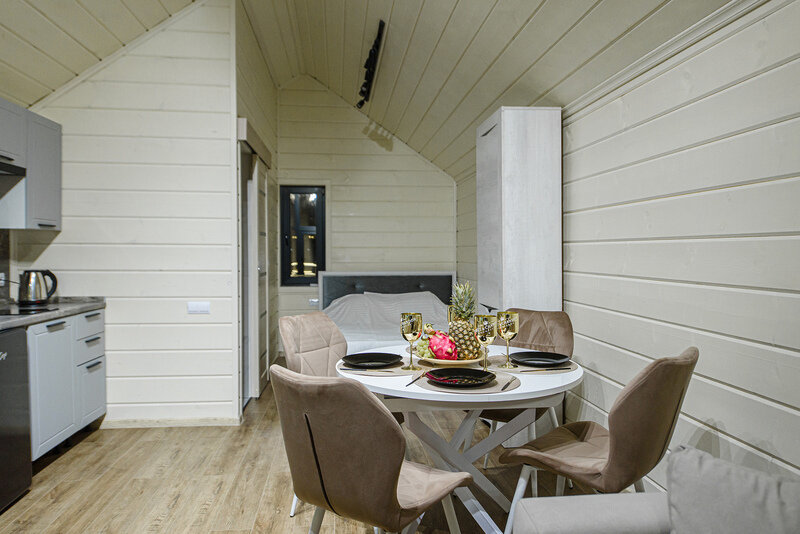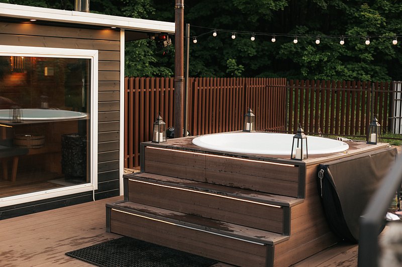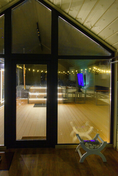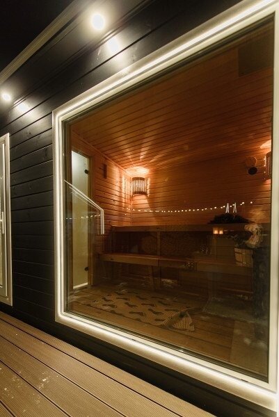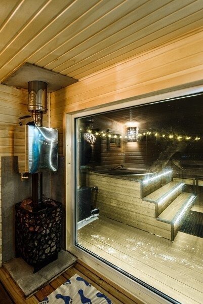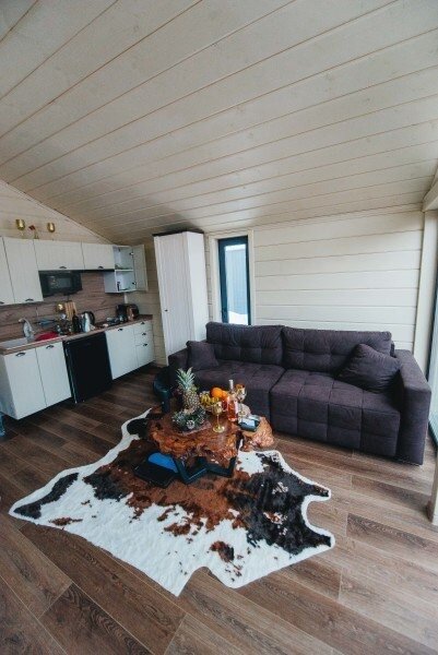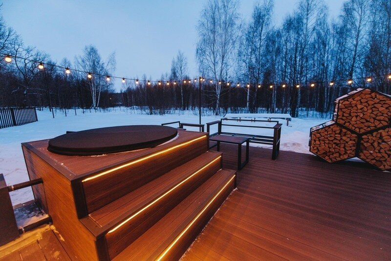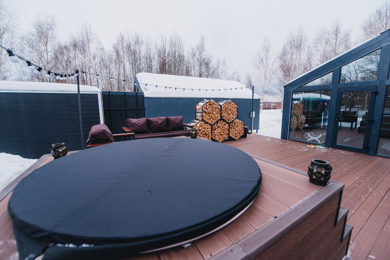 Для гостей доступны три отдельных дома со своей террасой, баней и джакузи. Каждый домик закрыт от других забором, таким образом создавая собственную огороженную территорию. Дома оснащены умной системой «Алиса», посредством которой можно управлять домом.