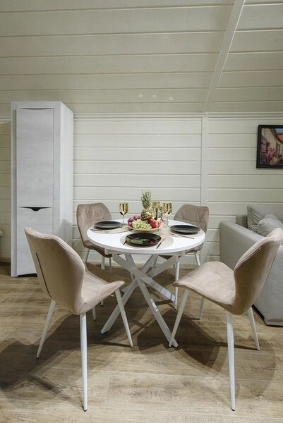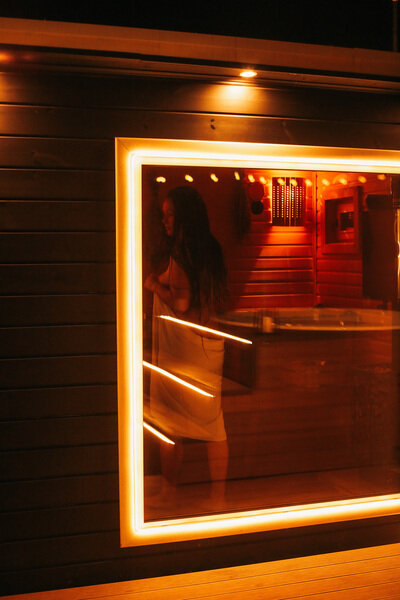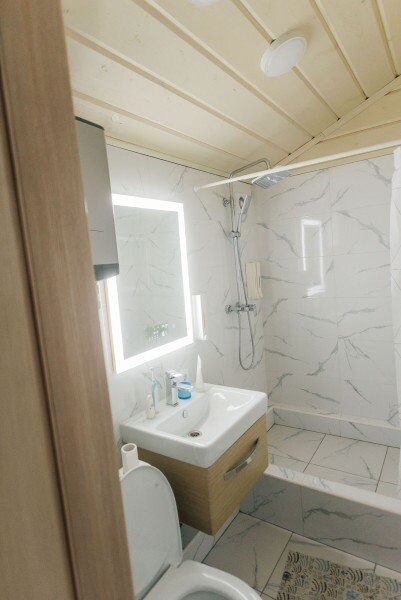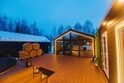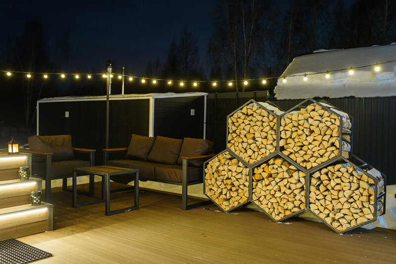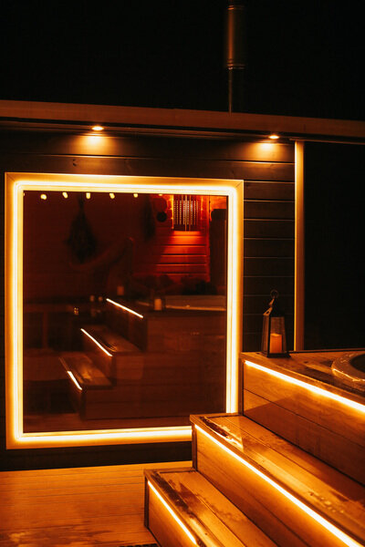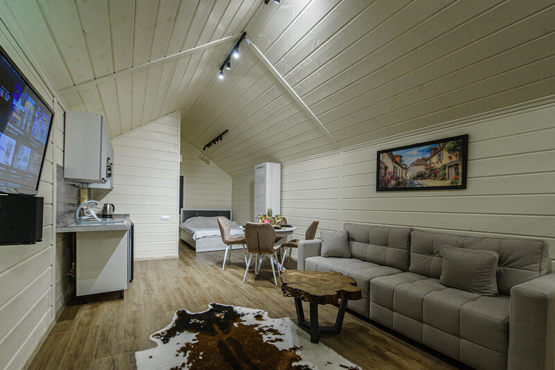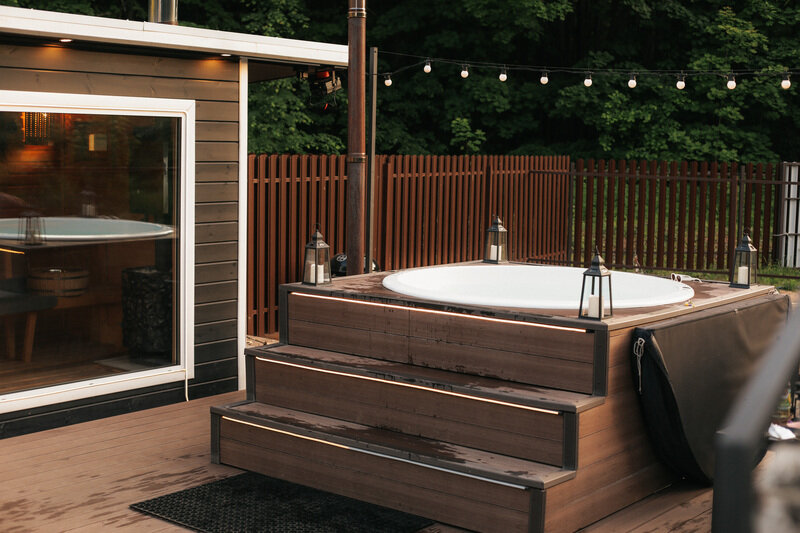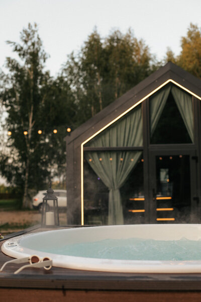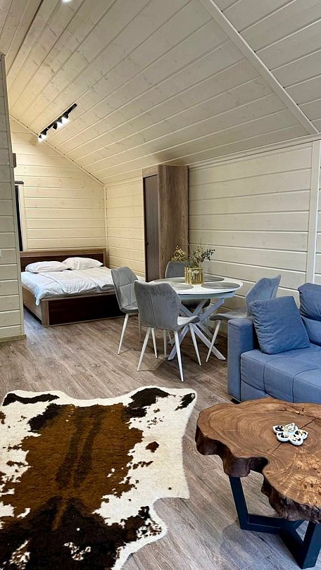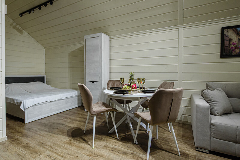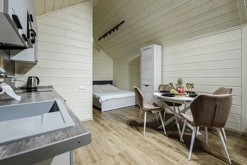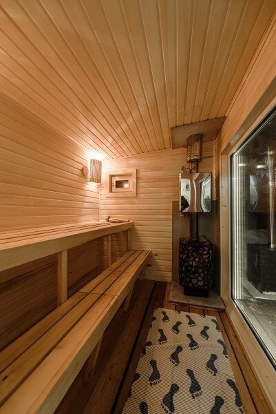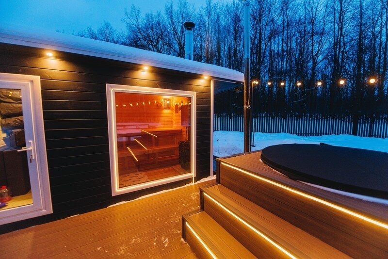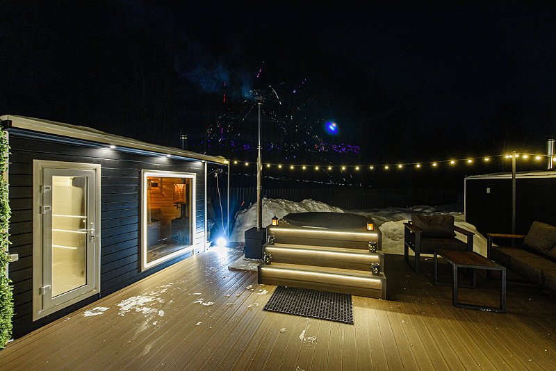 Для гостей доступны три отдельных дома со своей террасой, баней и джакузи. Каждый домик закрыт от других забором, таким образом создавая собственную огороженную территорию. Дома оснащены умной системой «Алиса», посредством которой можно управлять домом.