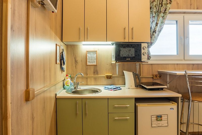 В номере раздвижная кровать. По предварительному запросу гостей (не менее суток до даты заезда) номер будет подготовлен на два отдельных спальных места или одно двуспальное. В номере приватная кухонная зона с одноконфорочной индукционной плитой, холодильником, микроволновой печью, столом, стульями, посудой для приготовления еды и сервировки стола. В номере ТВ, показывает 20 каналов. В индивидуальном санузле душ, унитаз и раковина. Зона барбекю без дополнительной оплаты в любое удобное время (5 столов, стулья, 3 мангала, освещение в ночное время, навес от снега и дождя). Беседка общая на 7 номеров, но места хватает всем. Из номера вида на Волгу нет. Для удобства гостей есть общая гардеробная-сушилка для одежды (расположена на 3 этаже).