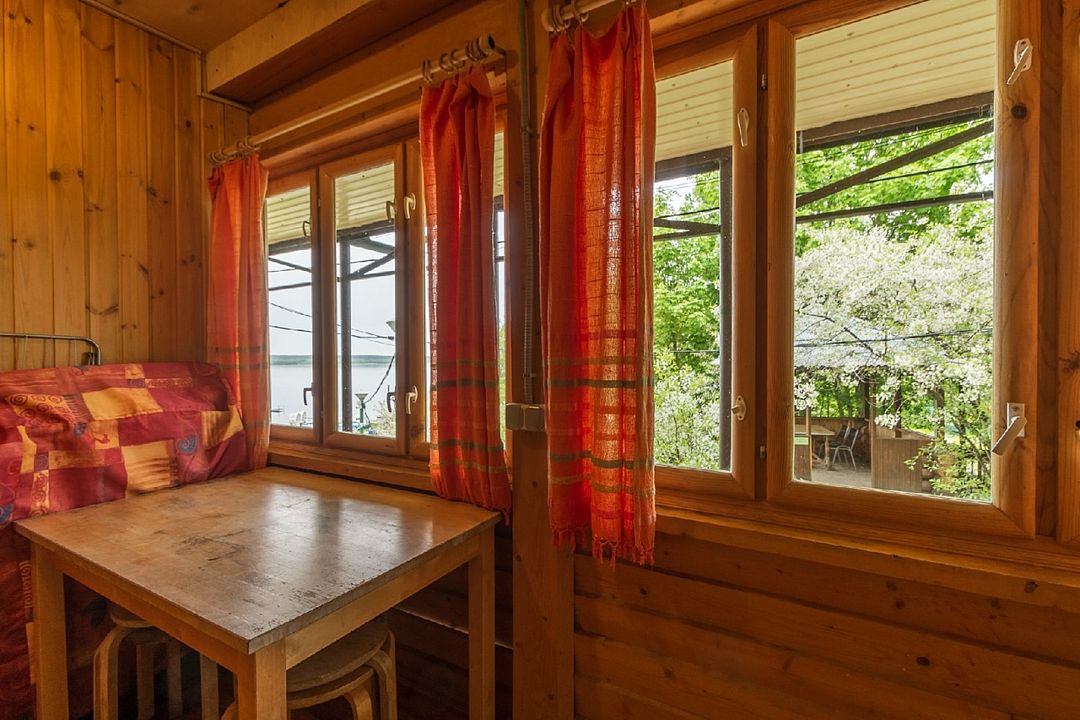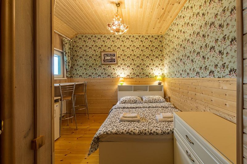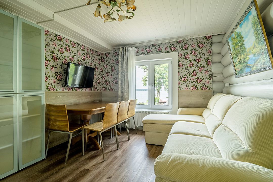 С улицы гости попадают на веранду. Веранда зимой не отапливается. Здесь можно удобно расположить рыболовное снаряжение. С веранды гости попадают в кухню-гостиную. В кухне-гостиной двуспальный диван, кухонный гарнитур с газовой плитой, холодильником, микроволновой печью, столом, стульями, посудой для приготовления еды и сервировки стола, ТВ со спутниковым телевидением. Из гостиной можно пройти в спальную комнату и санузел. В спальной комнате двуспальная кровать и односпальный диван. В санузле душ, унитаз и раковина. У номера своя приватная беседка с боковым видом на Волгу и мангальная зона. В беседке есть освещение. На беседке и доме есть светодиодные гирлянды. Гости могут их самостоятельно включить и выключить.