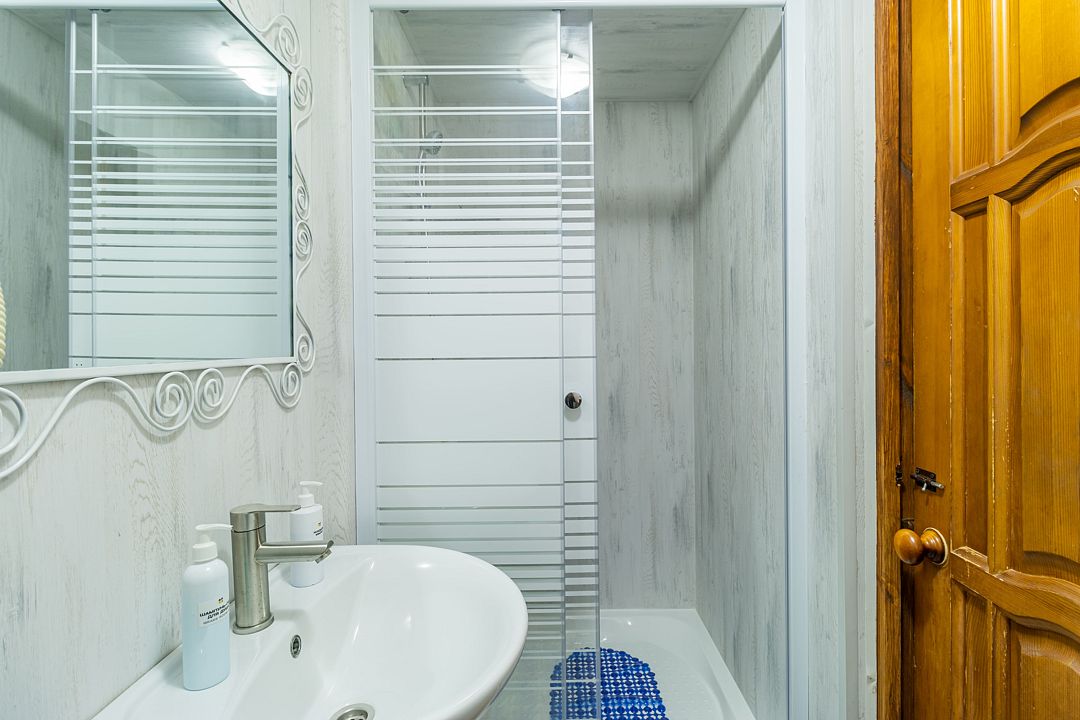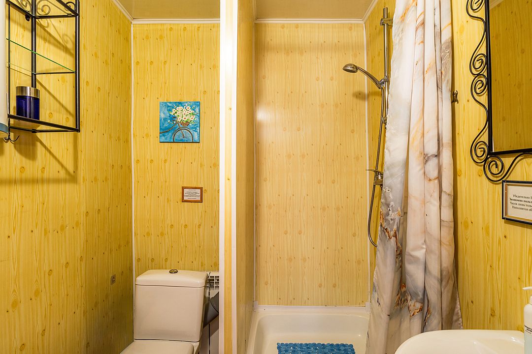В номере ТВ, показывает 20 каналов. В индивидуальном санузле душ, унитаз и раковина. Зона барбекю без дополнительной оплаты в любое удобное время (5 столов, стулья, 3 мангала, освещение в ночное время, навес от снега и дождя). Беседка общая на 7 номеров, но места хватает всем. Из номера вида на Волгу нет. Этот номер самый маленький и бюджетный ввиду своего размера. Длина спального места 190 см. Для удобства гостей есть общая гардеробная-сушилка для одежды (расположена на 3 этаже).