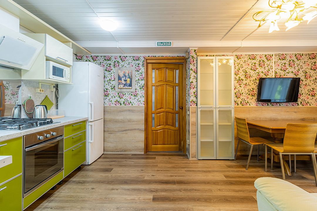 В кухне-гостиной диван, кресло, кухонный гарнитур с индукционной плитой, холодильником, микроволновой печью, столом, стульями, посудой для приготовления еды и сервировки стола. Диван не предназначен для сна (он не раскладывается). Из кухни-гостиной можно пройти в спальную комнату и санузел. В спальной комнате двуспальная кровать и односпальная кровать. В номере ТВ, показывает 20 каналов. В индивидуальном санузле душ, унитаз и раковина. Зона барбекю без дополнительной оплаты в любое удобное время (5 столов, стулья, 3 мангала, освещение в ночное время, навес от снега и дождя). Беседка общая на 7 номеров, но места хватает всем. Для удобства проживающих есть общая гардеробная-сушилка для одежды (расположена на 3 этаже). Из номера красивый вид на Волгу.